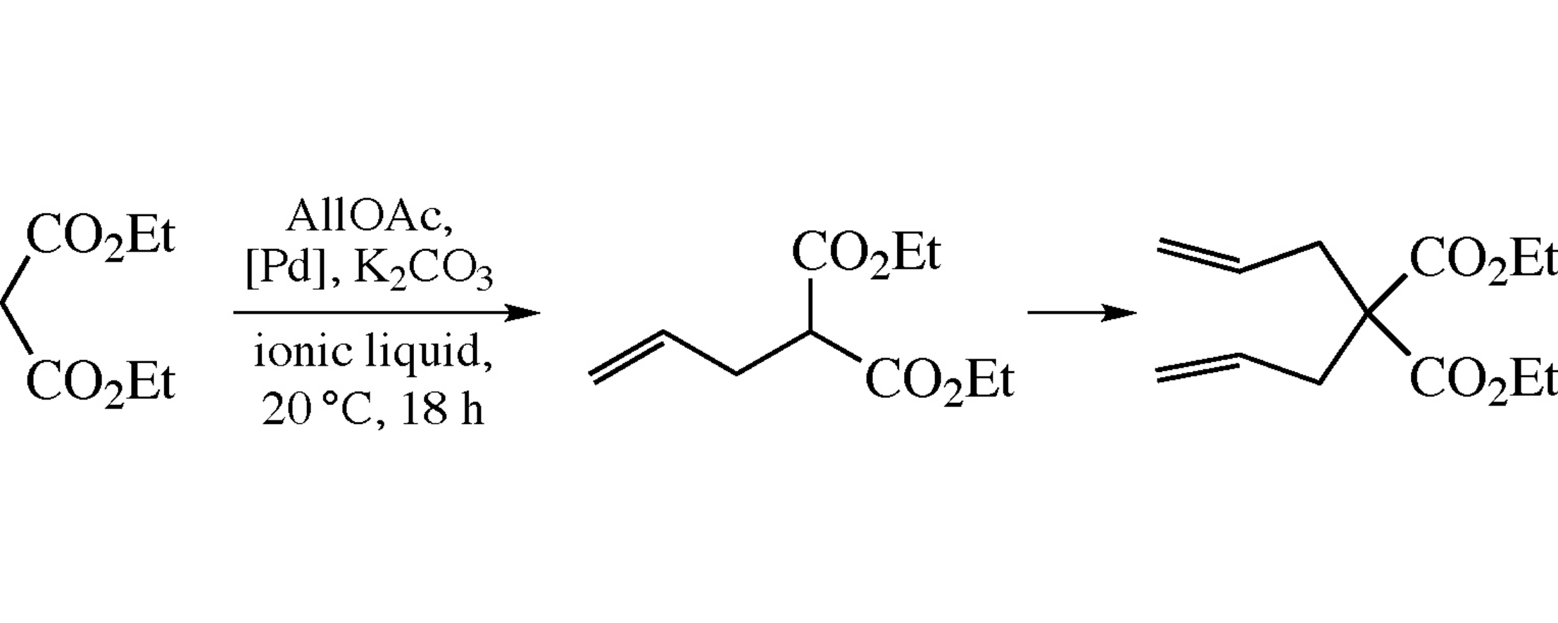 Palladium-catalyzed potassium carbonate-assisted reaction between diethyl malonate and allyl acetate in the presence of 1,3-dialkyl-imidazolium ionic liquids (ILs) as solvents or phase transfer catalysts affords major monoallylation product, whereas in the presence of 1,2,3-trialkylimidazolium or quaternary ammonium/phosphonium ILs diallylation product is preferably formed. These procedures are extended to some other CH-acids and allylic acetates.