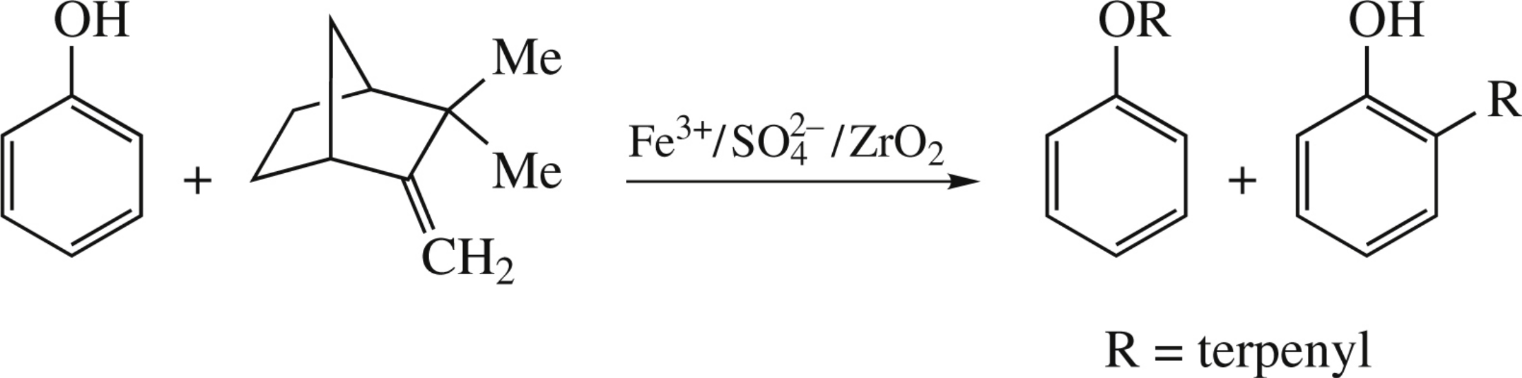 Sulfated zirconia modified with polyvalent cations is capable of catalyzing alkylation of phenol with camphene and isomerization of utane into isobutane.