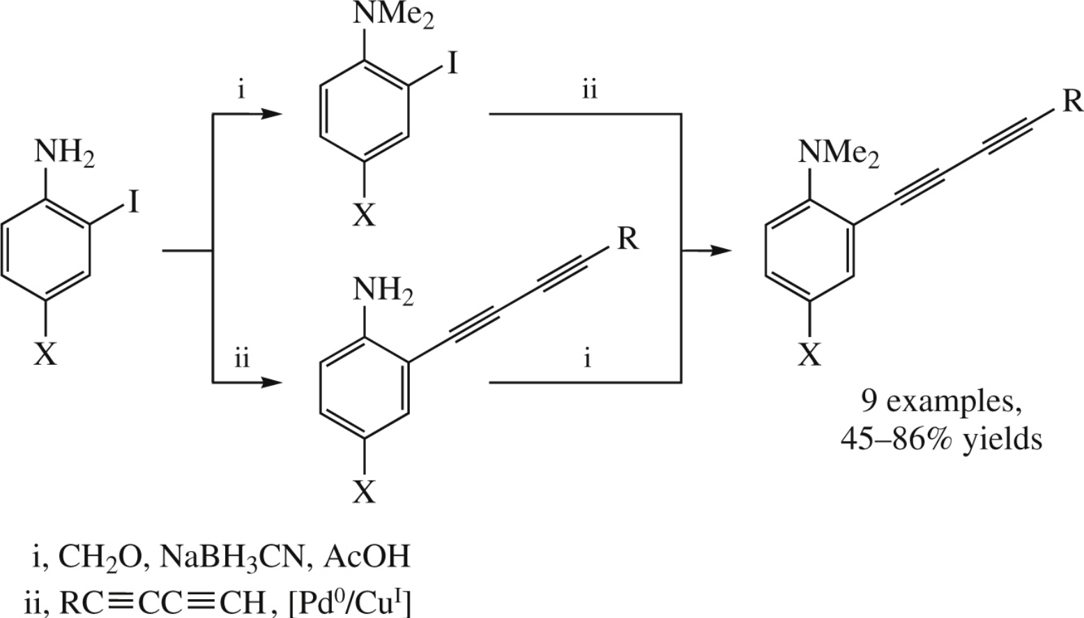 Synthesis of 2-(buta-1,3-diynyl)-N,N-dimethylanilines based on reductive methylation of ortho-iodoanilines using CH2O–NaBH3CN and coupling with terminal diacetylens was developed. Altered sequence including dimethylation of 2-(buta-1,3-diynyl)anilines was also successfully achieved and gave higher overall yields in the case of anilines without acceptor substituent in the ring.