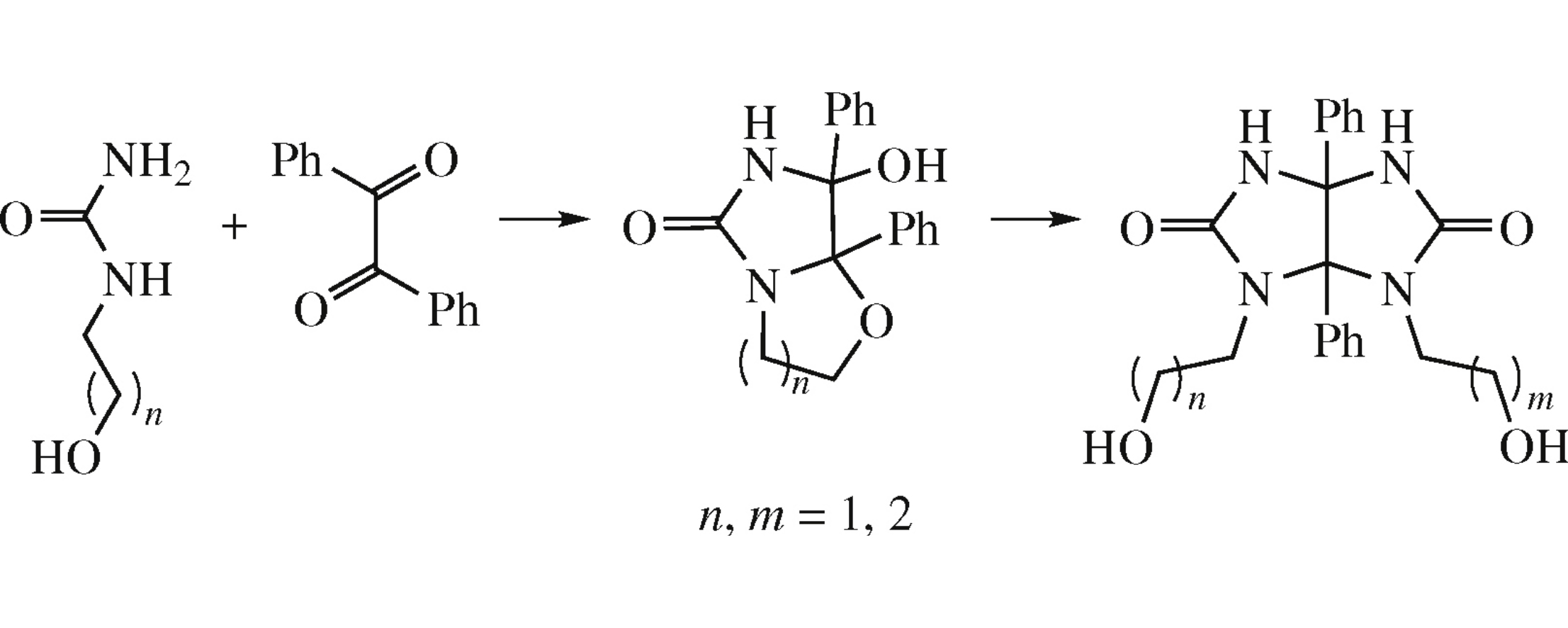 A new synthetic approach to 2,8-disubstituted 1,5-diphenylglycolurils is based on condensation of 1-(hydroxyalkyl)ureas (ureido alcohols) with tetrahydroimidazooxazolone and tetrahydroimidazooxazinone derivatives which were unexpectedly obtained by acid-catalyzed reaction of ureido alcohols with benzil. An X-ray diffraction study of the supramolecular organization of the obtained compounds revealed the chirality of the crystals of achiral glycoluril molecules.