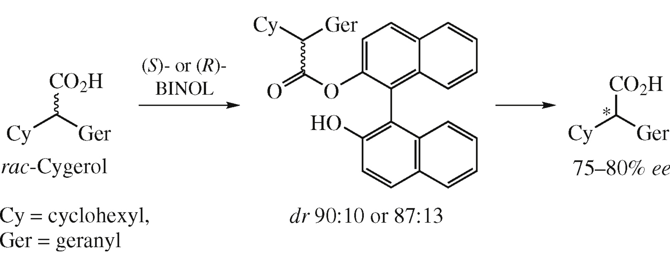 A kinetic resolution of racemic (cyclohexyl)(geranyl)acetic acid, the active ingredient of wound-curing medication Cygerol, to (S)- and (R)-enantiomers was achieved by diastereoselective esterification with (S)- or (R)-BINOL.