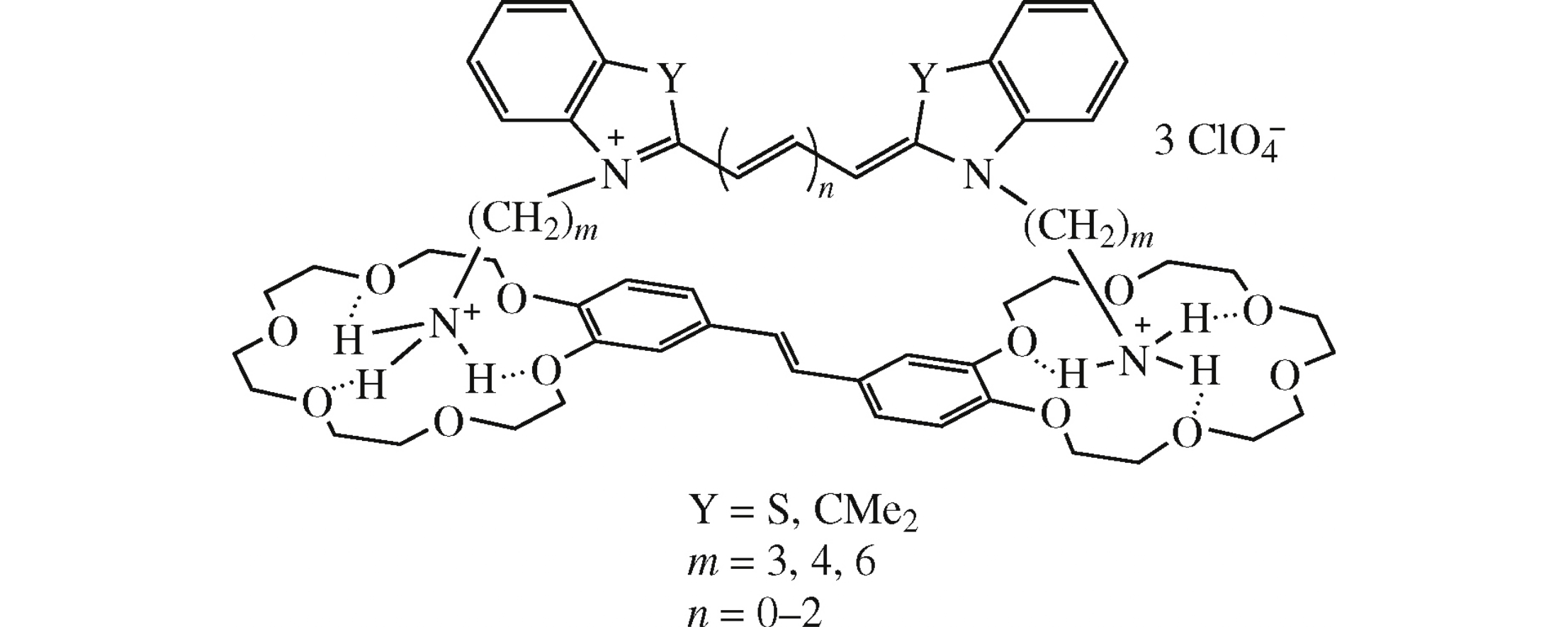 Mono-, tri-, and pentamethine cyanine dyes containing two terminal ammonium groups in the N-substituents and bis(18-crown-6)- stilbene in MeCN form pseudocyclic 1:1 complexes (log K1:1 up to 8.1) and triple-decker 1:2 complexes (log K1:2 up to 2.6).