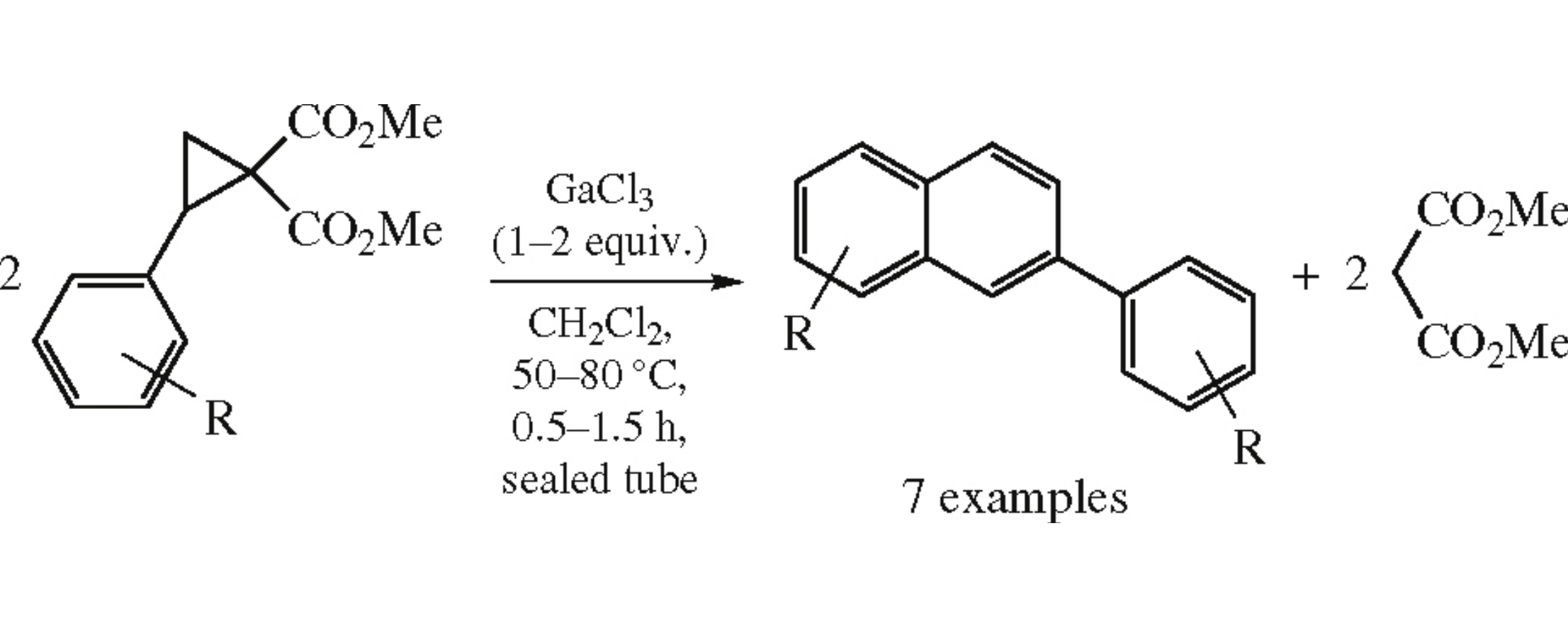 Dimethyl 2-arylcyclopropane-1,1-dicarboxylates on heating with GaCl3 undergo dimerization to afford arylnaphthalenes or phenanthrenes. A possible reaction mechanism including elimination of two dimethyl malonate molecules was proposed, dimethyl malonate gallium complex Ga3+[H2C(CO2Me)2]3(GaCl–) was isolated and characterized by X-ray diffraction analysis.