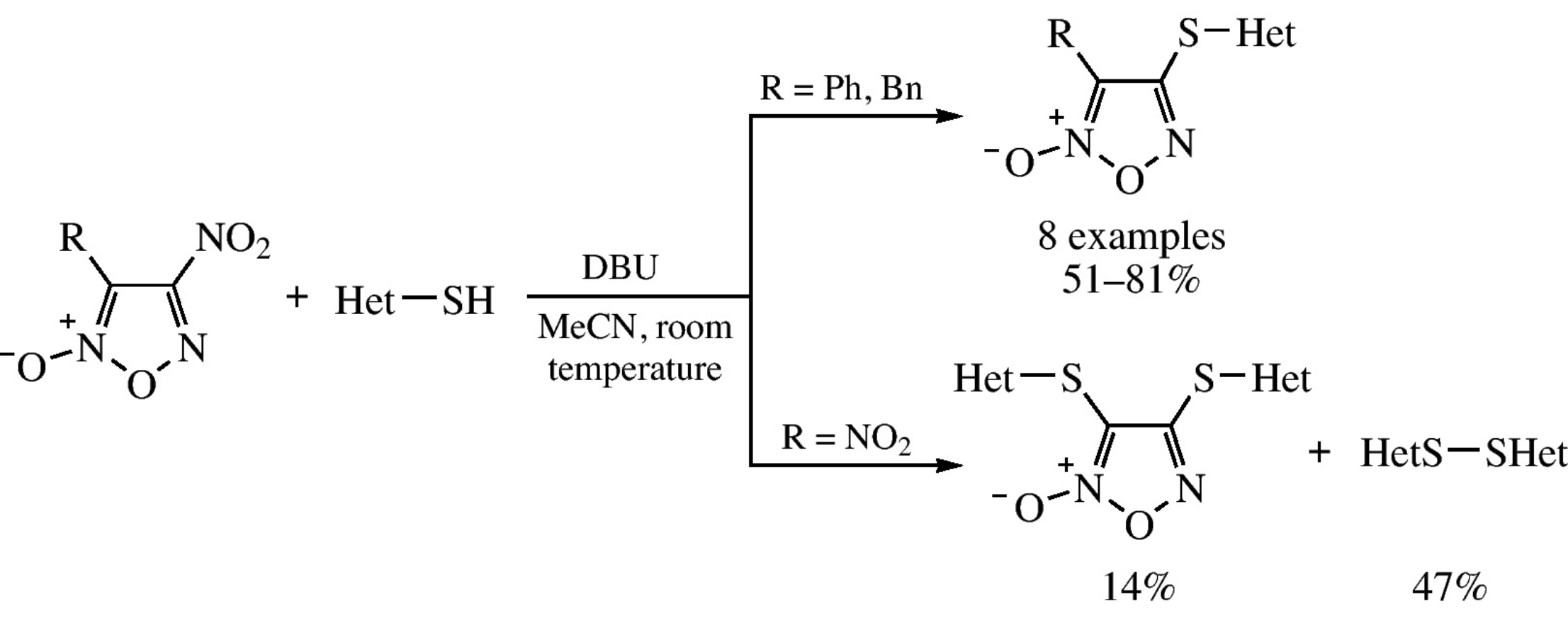 Hetarylthiofuroxans were synthesized by nucleophilic substitution of the nitro group in 4-nitrofuroxans under the action of hetarylthiols in the DBU–MeCN system at room temperature, reactivity of 4-nitrofuroxans being dependent on the C(3)-substituent.