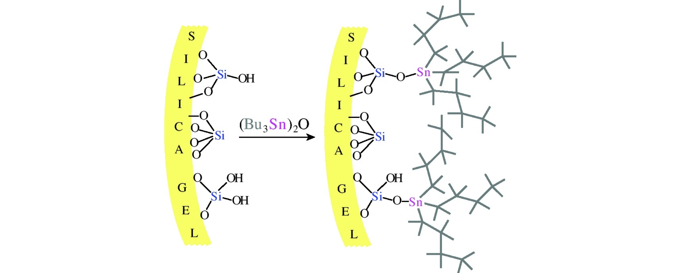 Bis(tri-n-butyltin) oxide quickly reacts with chromatographic silica gel even when a solution of this oxide is filtered through silica gel, which results in stannylation of a fraction of the surface hydroxyl groups of silica gel to give n-Bu3SnOSi° moieties. The calculated surface density of these moieties, 0.85 Sn groups per nm2, corresponds to complete coverage of silica gel surface with n-Bu groups.