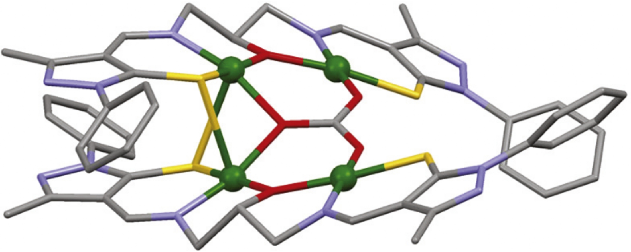 A carbonate-bridged tetranuclear CuII complex of the general formula [(Cu2L)2CO3]·2MeCN (L is triply deprotonated Schiff base condensation product of 1,3-diaminopropan-2-ol and 1-phenyl-3-methyl-4-formyl-5-mercaptopyrazole) has been obtained by the slow crystallization of dinuclear complex [(Cu2L)CCl3COO] from acetonitrile and studied by X-ray diffraction and low-temperature magnetic measurements.