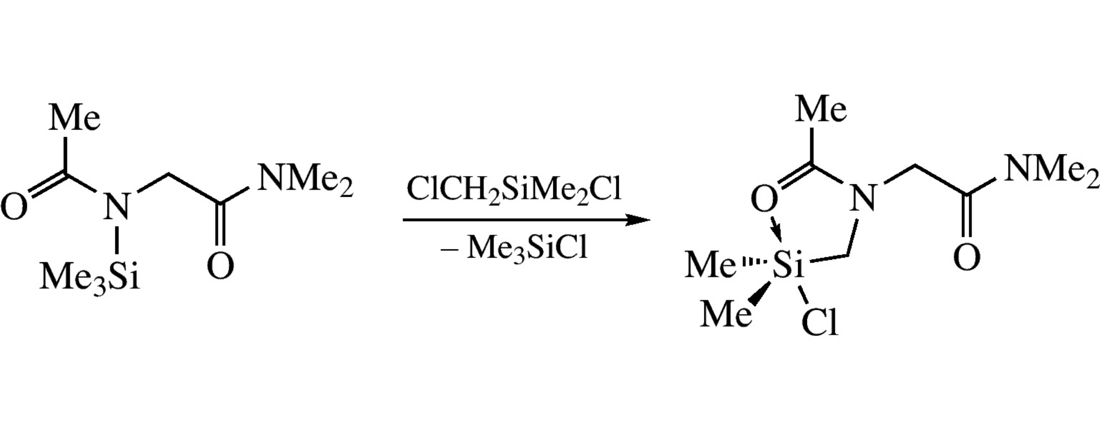 Regioselective reaction of N-trimethylsilyl-N-acetylglycine N’,N’-dimethylamide with chloro(chloromethyl)dimethylsilane yields chlorosilane MeC(O)N(CH2SiMe2Cl)CH2C(O)NMe2 with a five-membered C,O-chelate ring involving the N-acetyl group rather than the six-membered ring involving the N’,N’-dimethylamide fragment. According to X-ray data, the pentacoordinate silicon atom in the product has a TBP environment with the halogen and oxygen atoms in axial positions.