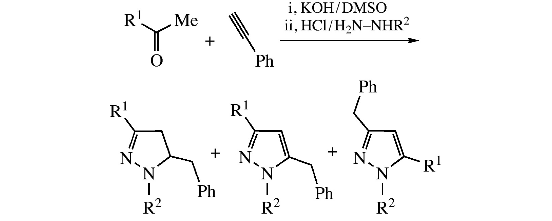 The sequential reaction of ketones with phenylacetylene in the presence of KOH/DMSO system followed by the treatment of the reaction mixture with HCl and monosubstituted hydrazines leads to pyrazolines and pyrazoles in up to 87% total yield.