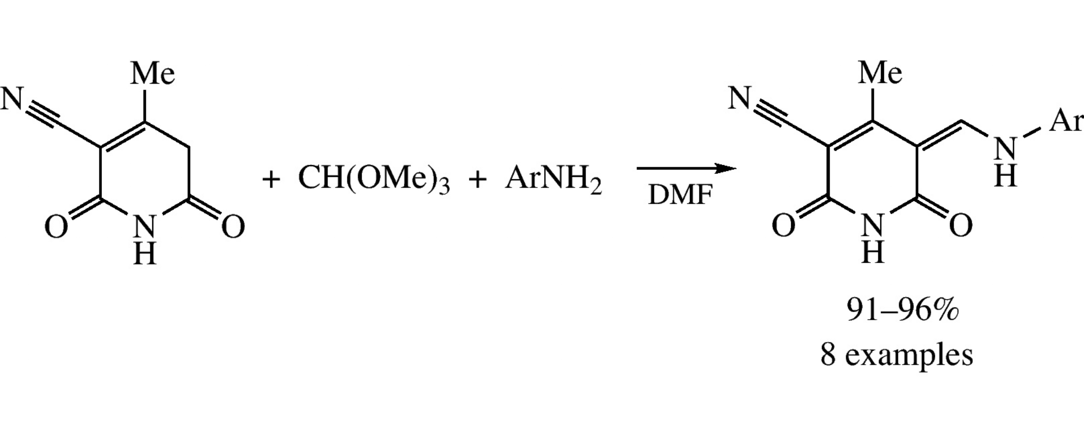 (Z)-5-(Arylaminomethylidene)-4-methyl-2,6-dioxo-1,2,5,6-tetrahydropyridine-3-carbonitriles were obtained by three-component condensation of 4-methyl-2,6-dioxo-1,2,5,6-tetrahydropyridine-3-carbonitrile with aromatic amines and trimethyl orthoformate in DMF. According to X-ray data, in the solid phase they exist as amino enone tautomers.
