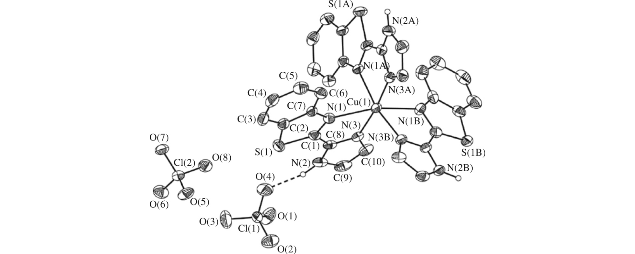 The new copper(II) complex [Cu(IBT)3](ClO4)2 [where IBT = 2-(1H-imidazol-2-yl)-1,3-benzothiazole] has been synthesized and characterized by single crystal X-ray crystallography, showing a slightly distorted octahedral coordination geometry, in which two nitrogen atoms of each IBT molecule coordinate the copper ion.