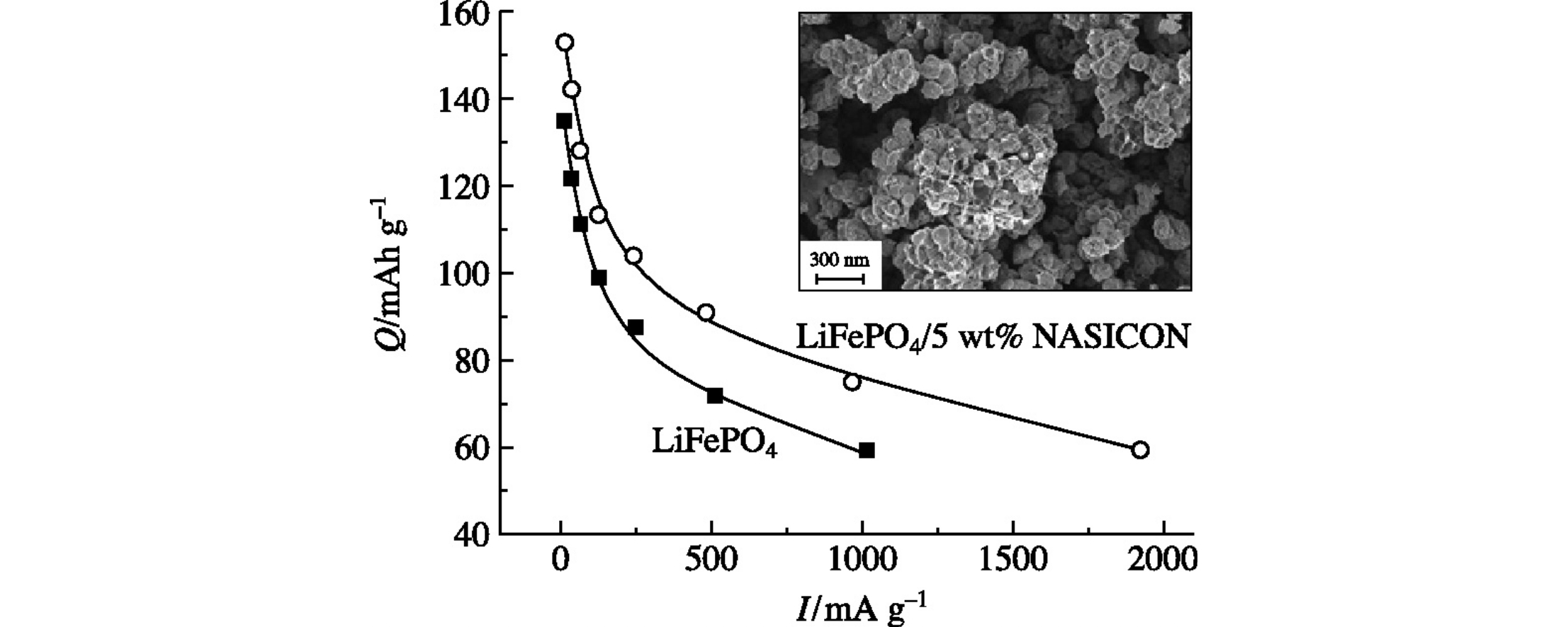 Composite materials based on LiFePO4 with olivine structure and Li1.3Ti1.7Fe0.3(PO4)3 with NASICON structure have been synthesized and characterized by the XRD analysis, scanning electron microscopy and impedance spectroscopy. The investigation of electrochemical behavior of obtained composites additionally coated with a thin carbon layer demonstrated that the LiFePO4-based materials doped by phosphate with the NASICON structure exhibit higher electrochemical capacity in comparison with the initial LiFePO4.