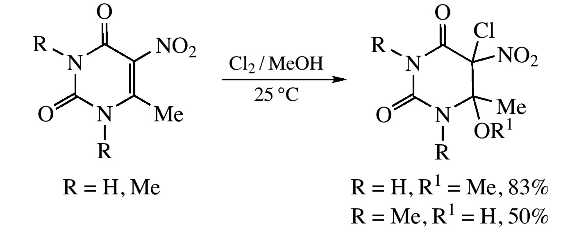 The chlorination of 6-methyl-5-nitrouracil with chlorine in methanol results in a two-component mixture of 5-chloro-6-methyl-6-methoxy-5-nitro-5,6-dihydrouracils, while the chlorination of 5-nitro-1,3,6-trimethyluracil under similar conditions gives a mixture of 5-chloro-6-hydroxy-5-nitro-1,3,6-trimethyl-5,6-dihydrouracils. The structures of the chlorination products were suggested based on quantum-chemical calculations