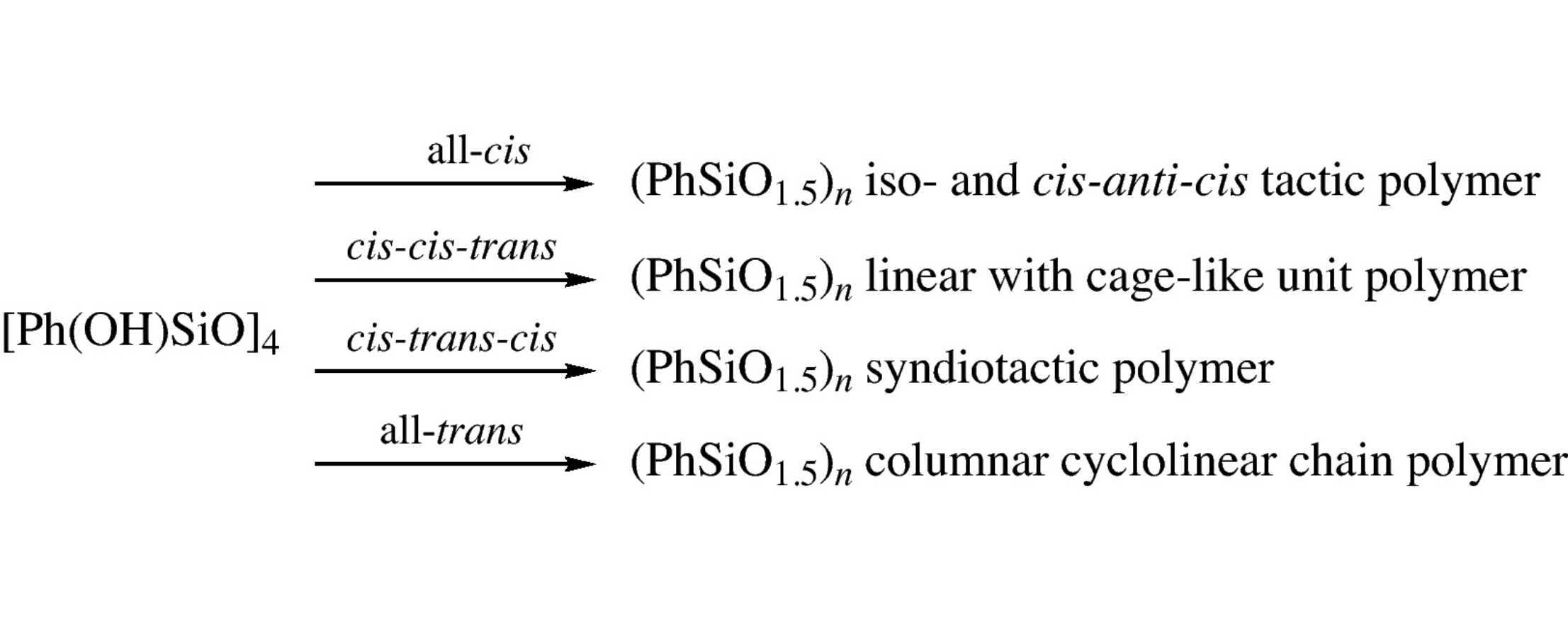 Polycondensation of four stereoisomers of (tetrahydroxy)(tetraphenyl)cyclotetrasiloxane in solution in the presence of layeredarchitecture compounds afforded polyphenylsilsesquioxanes with different conformational and configurational structures of the siloxane framework, determined by IR, 29Si NMR spectroscopy, powder X-ray diffraction and MALDI analysis.