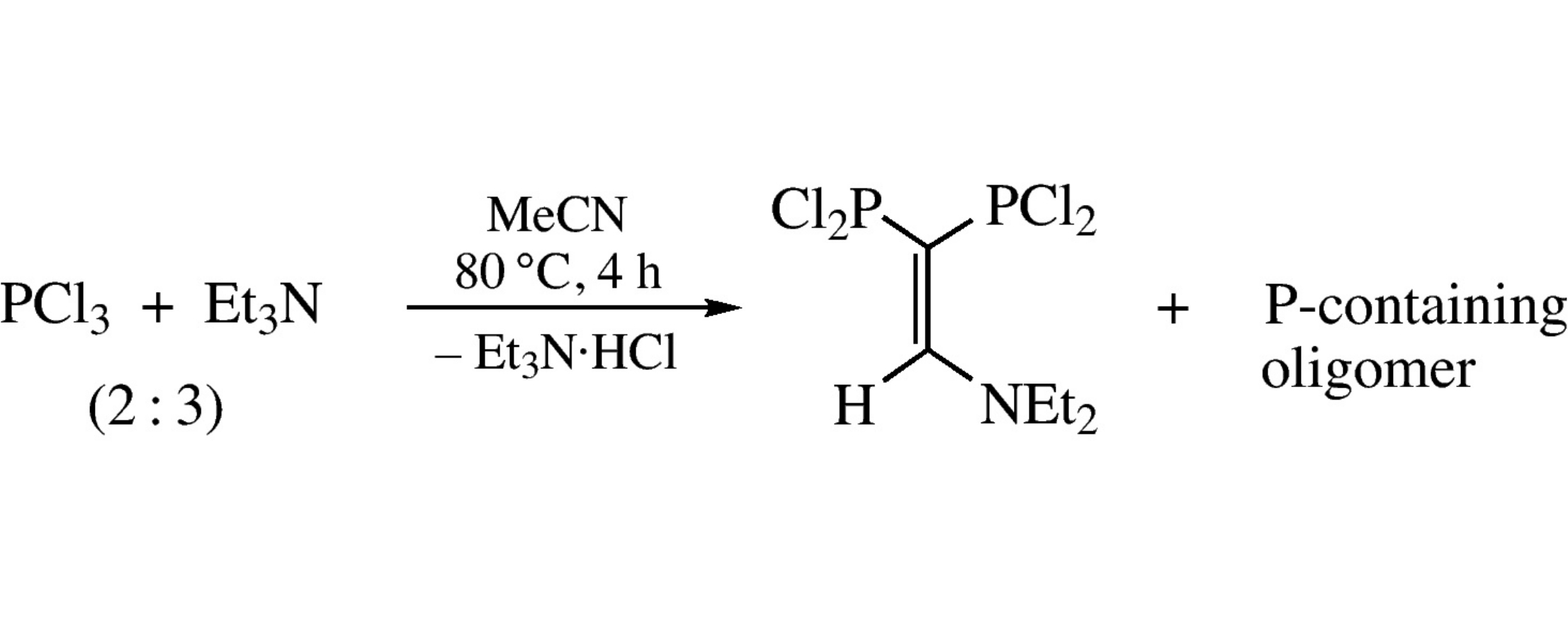 Heating of trichlorophosphine with triethylamine in acetonitrile (4h at 80°C) affords 2,2-bis(dichlorophosphino)-N,N-diethylethenamine in 38% yield and oligomeric product containing 60.5% of phosphorus.