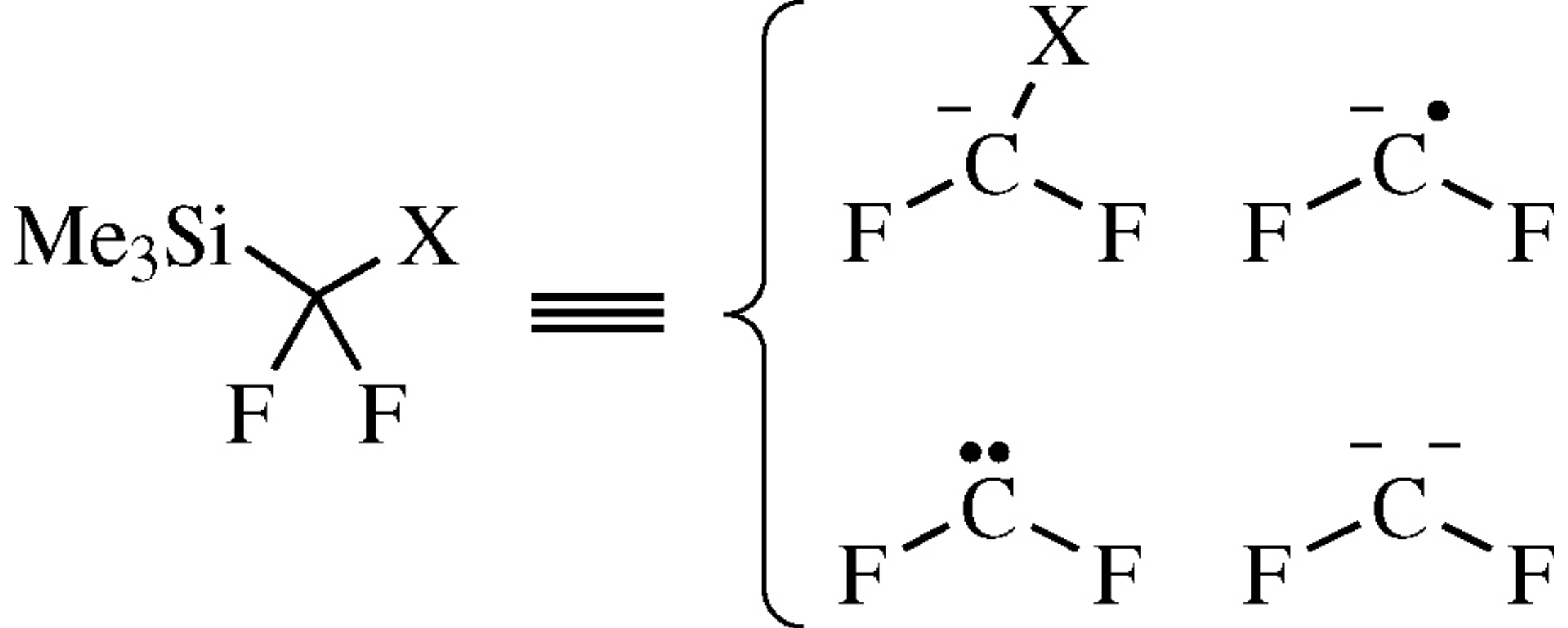 α-Fluorinated organosilanes Me3SiCF2X serve as versatile reagents for the synthesis of organofluorine compounds. Most reactions start from Lewis base activation of carbon–silicon bond through the intermediacy of five-coordinate siliconate species. Interaction of these silanes with suitable electrophiles leads to products of nucleophilic fluoroalkylation; an alternative pathway involves generation of difluorocarbene. These reagents can also be considered as equivalents of difluoromethylene radical anion and bis(carbanion) when carbon–heteroatom bond C–X is activated.