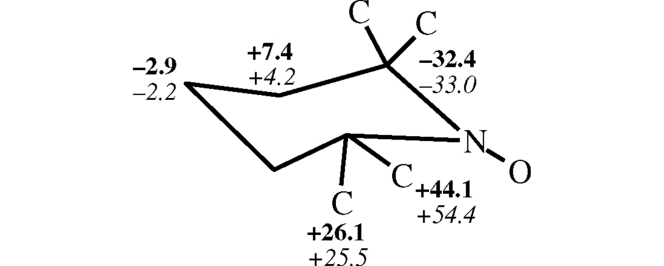 The signs of spin density on the carbon atoms and protons attached to them in nitroxides (nitroxyl radicals) with fixed geometry strictly alternate demonstrating unambiguously that spin propagation along the carbon chains of saturated C–C bonds occurs by a mechanism of spin polarization. Spin densities, both calculated and measured by NMR spectroscopy, exhibit convincing agreement both in signs and magnitudes.
