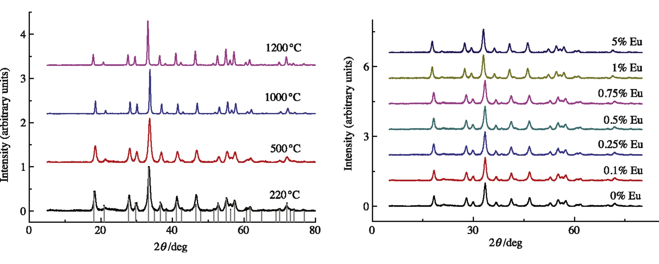 Eu3+-doped holmium aluminum garnet (Ho3Al5O12, HoAG) has been synthesized by a solvothermal method and annealed at various temperatures. The X-ray diffraction patterns confirmed that single-phase HoAG was obtained already at 220°C.