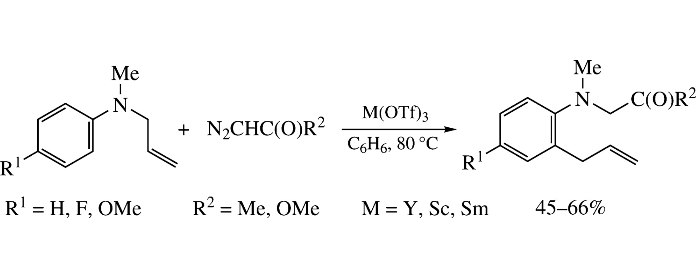 N-Allyl-N-methylanilines react with methyl diazoacetate or diazoacetone in the presence of Y, Sc or Sm triflates to give the corresponding methyl N-(2-allylaryl)-N-methylglycinates or 2-allyl-N-methyl-N-(2-oxopropyl)aniline. The formation of these compounds involves the aza-Claisen rearrangement.