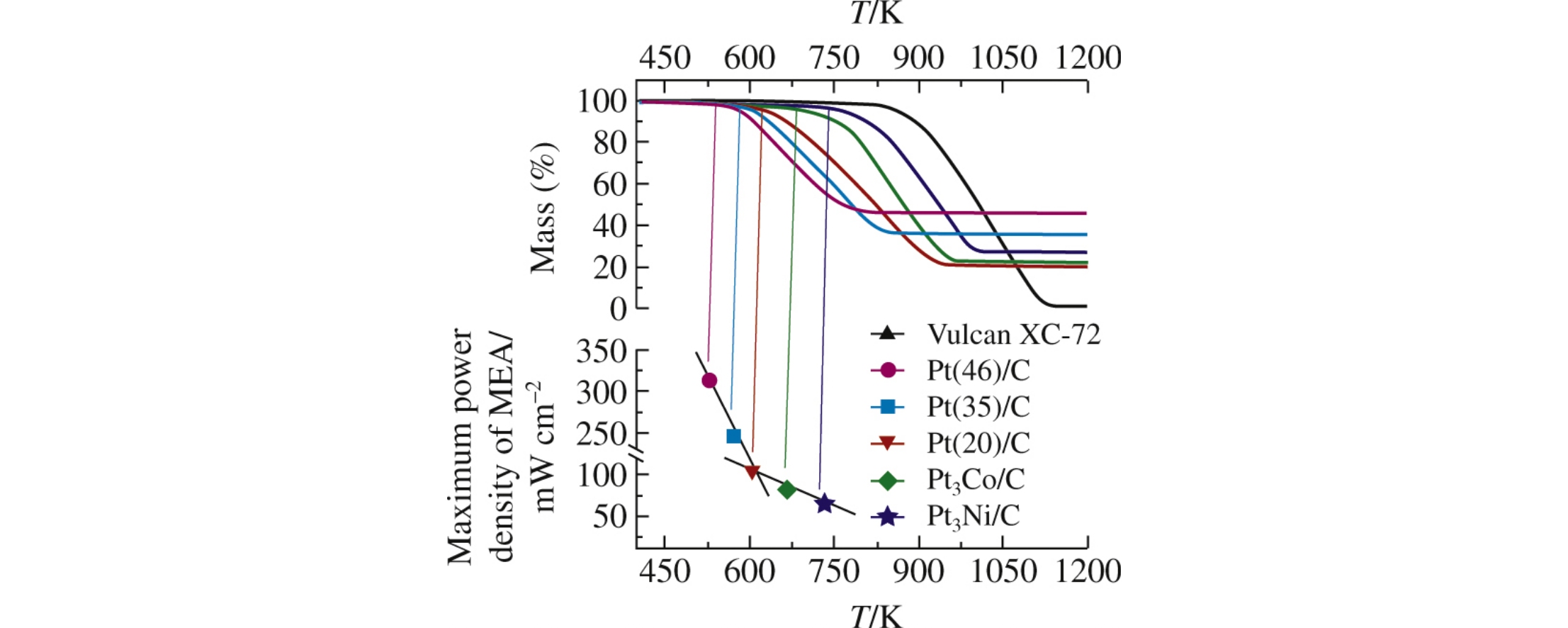 Investigations of carbon-supported Pt, Pt3Co, and Pt3Ni electrocatalysts using thermal gravimetric analysis (TGA) in combination with electrochemical measurements of the membrane electrode assemblies (MEA) for proton exchange membrane fuel cells have demonstrated that the onset temperature of the carbon support thermal oxidation and apparent activation energy of this reaction decrease in the following orders: Pt(20%)/C > Pt(35%)/C > Pt(46%)/C and Pt3Ni/C > Pt3Co/C > Pt/C, while MEA power density increases. Thus, TGA can be used as a simple and express technique for analysis of the electrocatalytic activity of carbon-supported Pt-based catalysts for proton exchange membrane fuel cells.