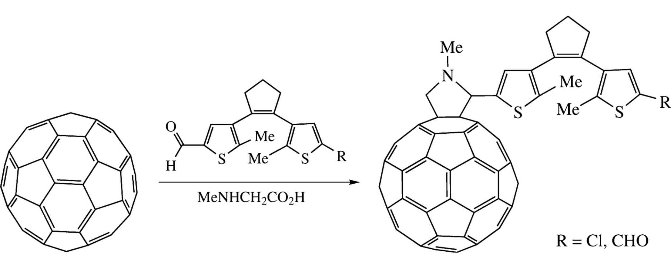 Dithienylethene-containing fulleropyrrolidines were synthesized by 1,3-dipolar cycloaddition of in situ generated appropriately derivatized azomethine ylides to C60. The photochromic properties of these cycloadducts were predicted resorting to DFT calculations.