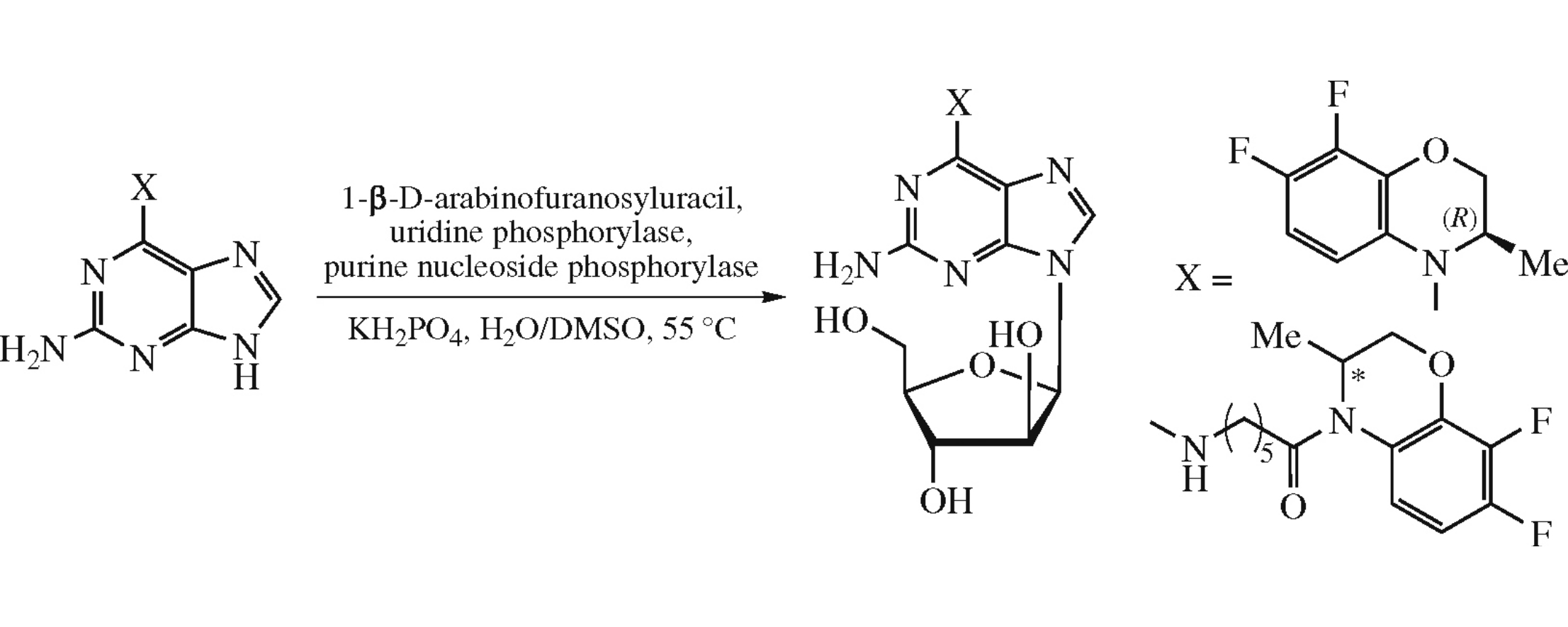 Chemoenzymatic transglycosylation of 2-aminopurine conjugates with enantiomerically pure 7,8-difluoro-3-methyl-3,4-dihydro-2H-[1,4]benzoxazines under the action of recombinant E. coli purine nucleoside phosphorylase afforded the corresponding arabinofuranosides, yields of the target compounds being dependent on both the structure and configuration of the fragment of heterocyclic amine attached at C-6 position of purine moiety.