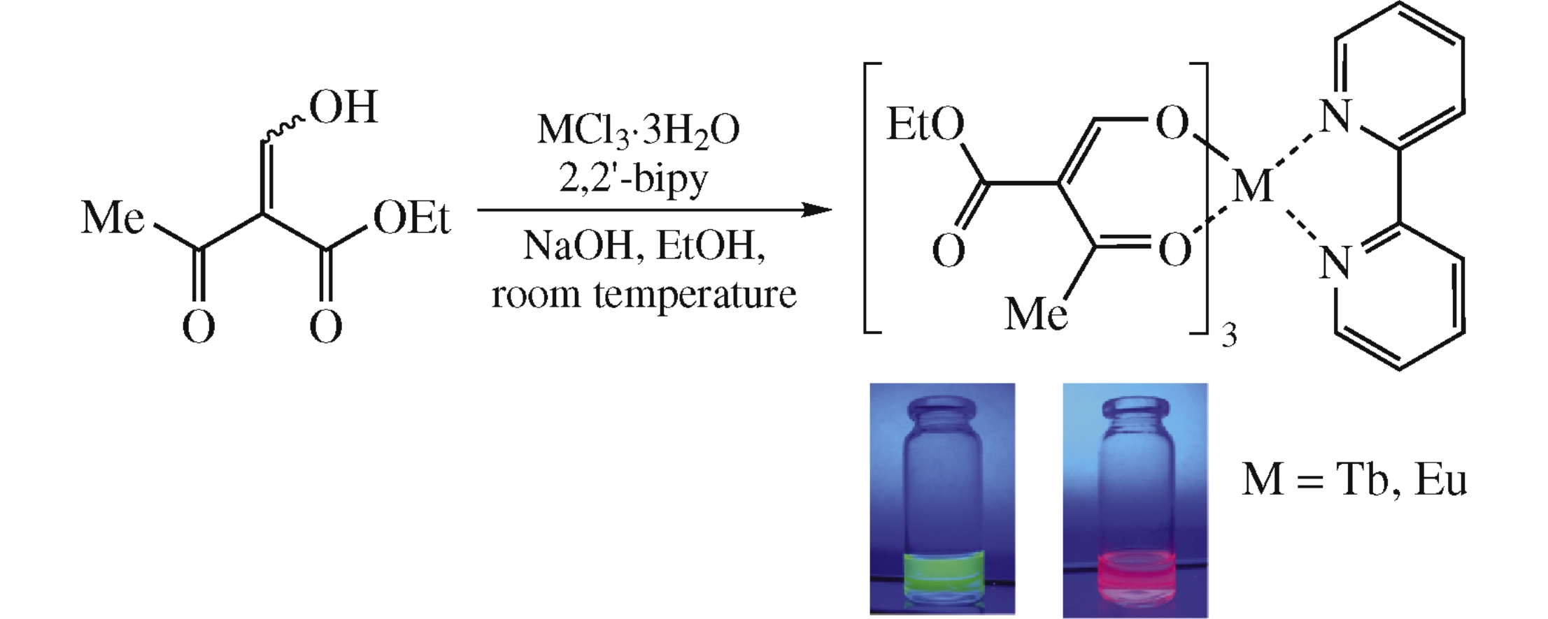 The reaction of europium(iii) or terbium(iii) chlorides with ethyl 2-hydroxymethylidene-3-oxobutanoate in the presence of 2,2’-bipyridine (2,2’-bipy) resulted in the luminescent complexes [LnL3]·2,2’-bipy (L = ethyl 2-hydroxymethylidene-3-oxobutanoate, Ln = Tbiii or Euiii), whose molecular structure has been determined by X-ray analysis.