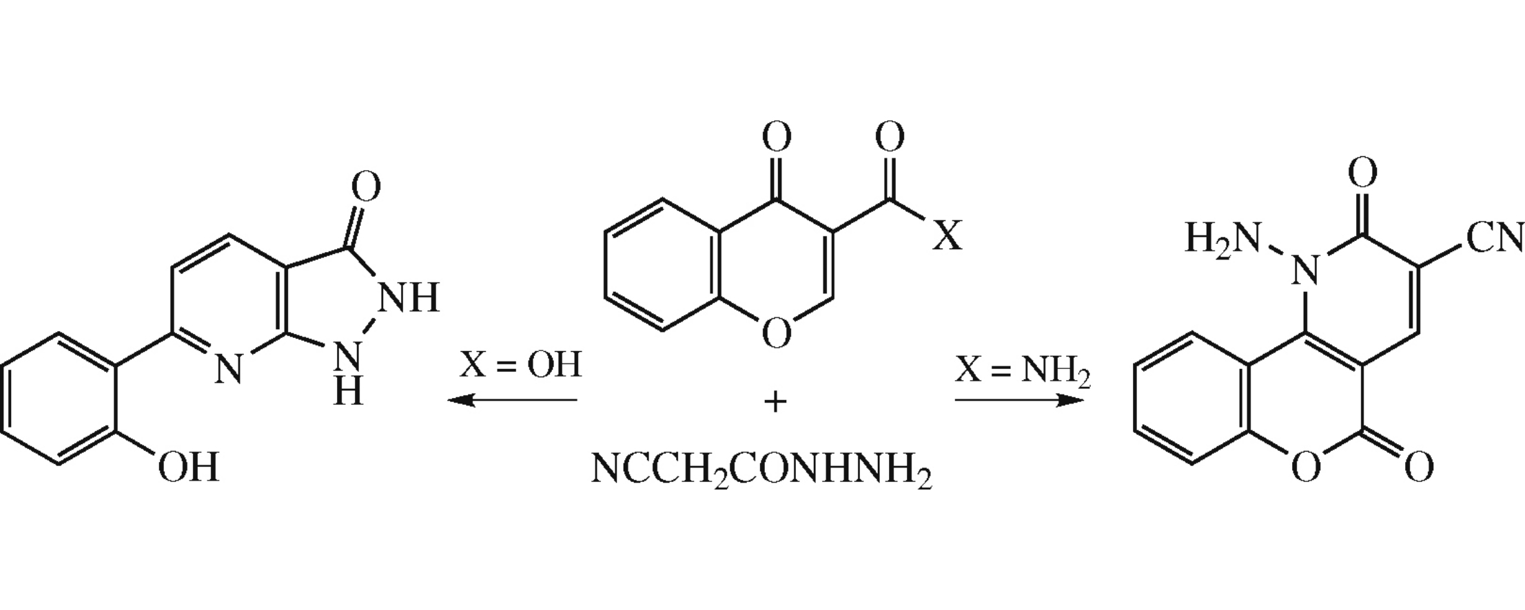 Chromone and chromone-3-carboxylic acid react with cyanoacetic acid hydrazide in the presence of NaOEt in boiling ethanol to form 6-(2-hydroxyphenyl)-1H-pyrazolo[3,4-b]pyridin-3(2H)-one (58–62% yields), whereas reaction between chromone-3-carboxamides and cyanoacetic acid hydrazide under the same conditions affords 1-amino-2,5-dioxo-2,5-dihydro-1H-chromeno[4,3-b]pyridine-3-carbonitriles (50–67% yields).