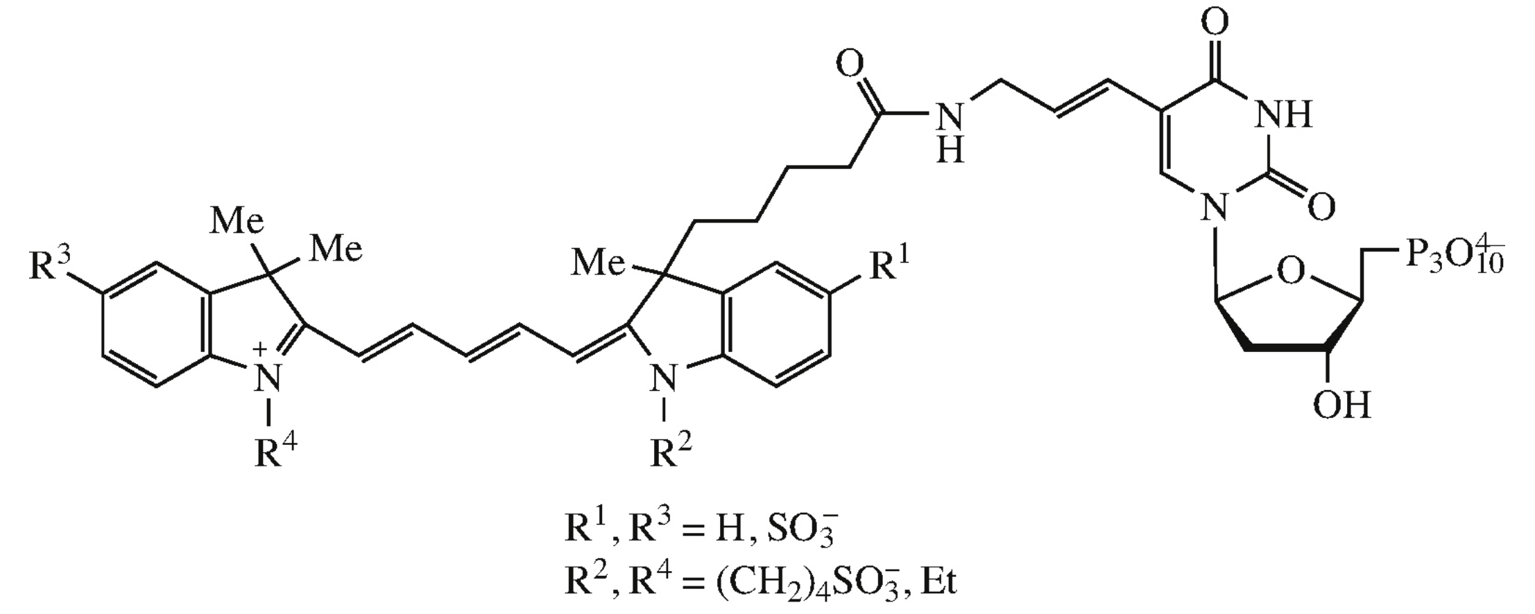 The novel C5-modified nucleotides containing indodicarbocyanine dye bearing a carboxyl group at the 3-position of indolenine have been synthesized and incorporated into DNA by commercially available thermostable Taq DNA polymerase. The efficiency of incorporation of labeled nucleotides during polymerase chain reaction was studied in a TB-biochip and THROMBO-Biochip test systems.