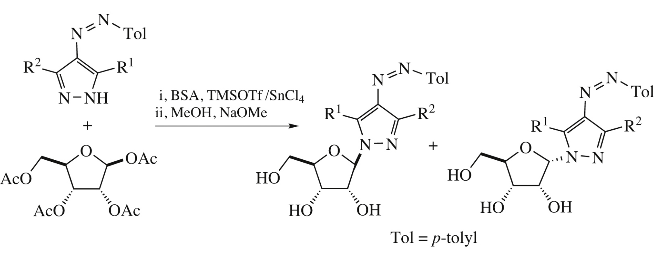 Ribosylation of 4-aryldiazenyl-3-R-5-R’-pyrazoles with 1,2,3,5-tetra-O-acetyl-β-D-ribofuranose in the presence of tin(IV) chloride gives α- and β-anomeric N-(2,3,5-tri-O-acetylribofuranosyl)-substituted derivatives. Their HPLC separation and deacetylation (MeOH, MeONa) affords 1-(β-D-ribofuranosyl)-3-R-5-R’-4-(aryldiazenyl)-1H-pyrazoles.