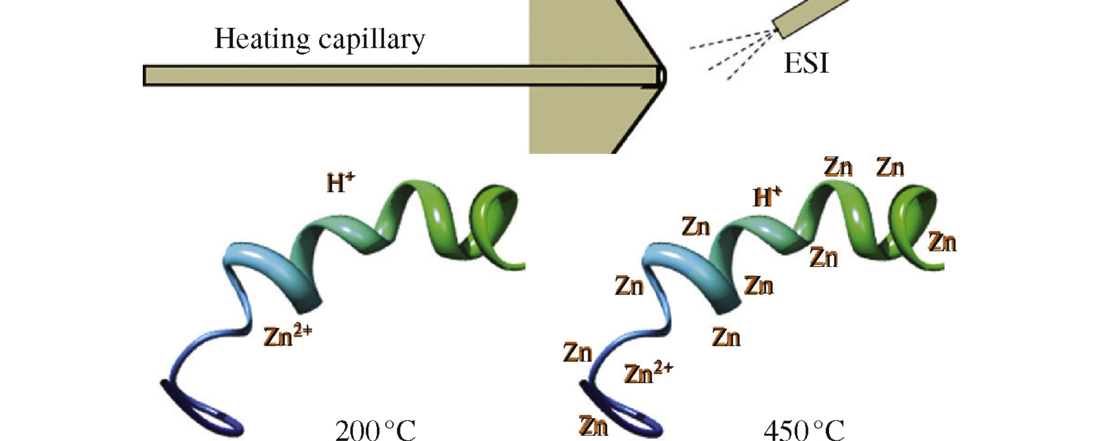 The formation of the gas phase complexes of a peptide that does not contain His and Cys residues and OH groups with up to six Zn atoms during electrospray ionization was observed.