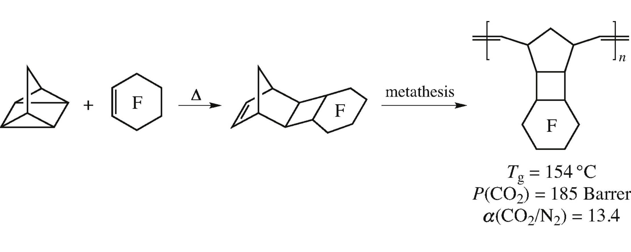 A new fluorine-containing tricyclononene was synthesized by [2σ + 2σ + 2π]-cycloaddition of quadricyclane with perfluorocyclohexene. This cycloadduct was subjected to ring-opening metathesis polymerization. Gas-transport properties of the obtained polymer were estimated.