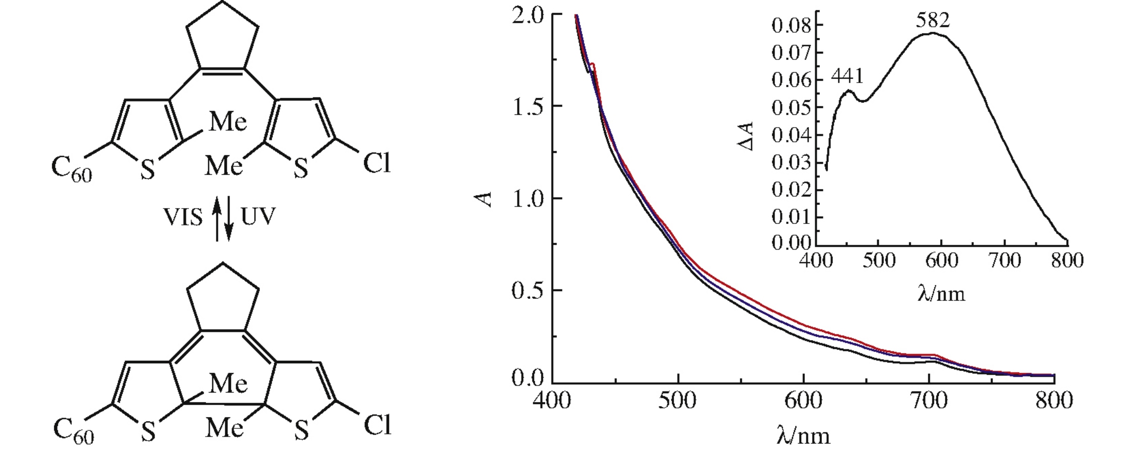 A dithienylethene-containing fullerocyclopropane was synthesized by the catalytic reaction of the carbon cluster with diazoalkane generated in situ by the oxidation of a corresponding photochrome hydrazone with MnO2 in the presence of the Pd(acac)2–2PPh3–4Et3Al catalyst, and the photochromic properties of the synthesized methanofullerene were evaluated.