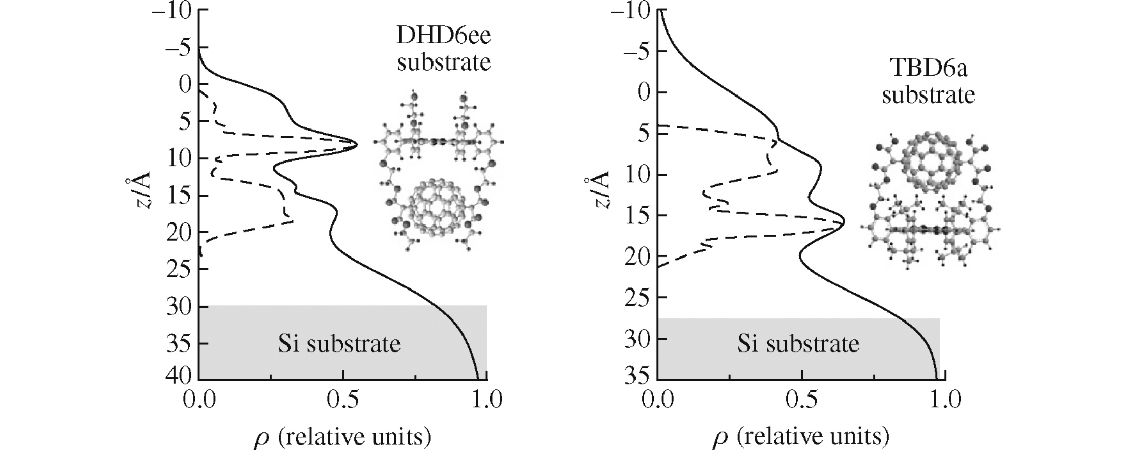 Donor–acceptor dyads are very promising compounds for low-cost organic photovoltaic devices. The orientation of porphyrin–fullerene dyads TBD6a and DHD6ee formed on a solid substrate by the Langmuir–Schaefer method is considered. It was shown by X-ray reflectivity that molecular orientation persisted during that transmission from liquid to solid surface in spite of the dyad molecules low anisometry.