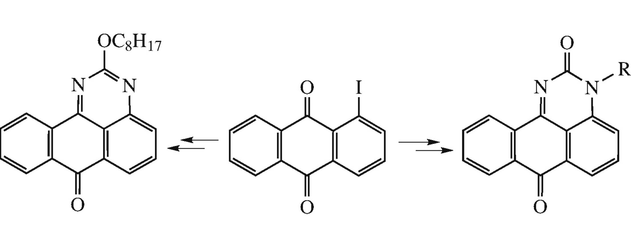 New 2-octyloxy-7H-benzo[e]perimidin-7-one and 3-benzylor 3-propargyl-3H-benzo[e]perimidine-2,7-diones were synthesized from 1-iodoanthraquinone. The propargyl derivative was subjected to Mannich and cycloaddition reactions.