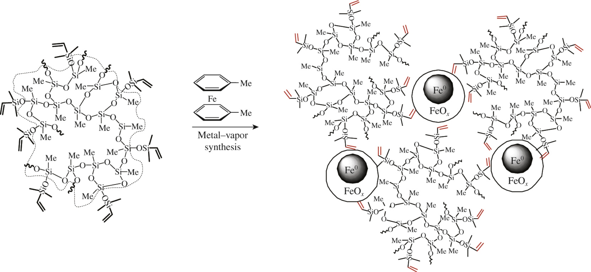 A series of novel hybrid materials with the core-shell structure have been prepared by the immobilization of iron nanoparticles on branched polymethylsilsesquioxanes. The metal–vapor synthesis has been used for the generation of iron nanoparticles.