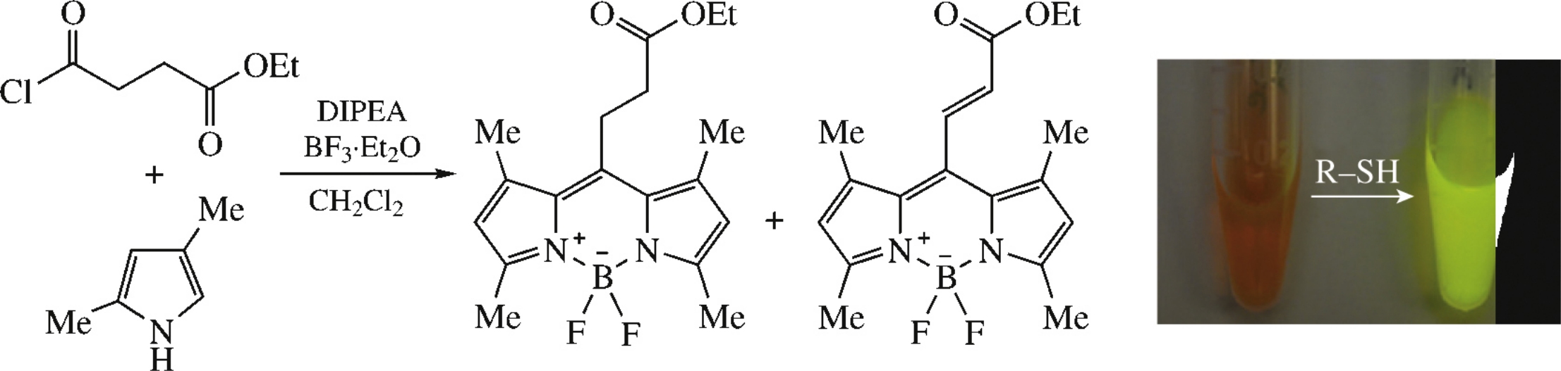 The meso-acrylic 1,3,5,7-tetramethyl-BODIPY derivative was obtained from 2,4-dimethylpyrrole and ethyl 4-chloro-4-oxobutanoate and its crystal structure was characterized by X-ray diffraction. This 8-alkenyl-BODIPY dye is originally nonfluorescent, but turns-on fluorescence upon the double bond reduction.
