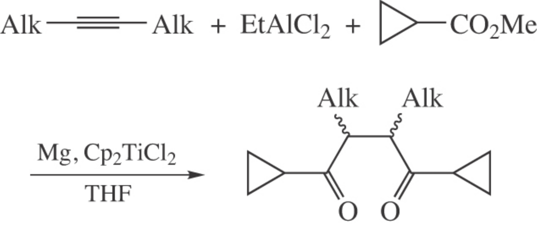 2,3-Dialkyl-l,4-dicyclopropylbutane-1,4-diones were prepared in one pot from symmetrical acetylenes, ethylaluminum dichloride and methyl cyclopropanecarboxylate in the presence of magnesium metal and Cp2TiCl2 (10 mol%) as a catalyst in 62–66% yield. Comparison of 1,4-dicyclopropylbutane-1,4-diones with other analogues to form furans in the course of the Paal–Knorr reaction was made by quantum chemical DFT calculations.
