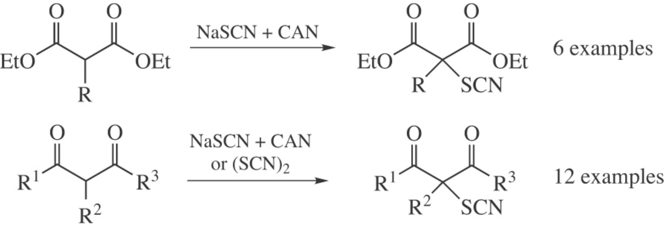 β-Diketones and β-oxo esters are thiocyanated with the NaSCN/(NH4)2 Ce(NO3)6 system or with pre-generated dirhodanogen. Malonates undergo thiocyanation only with the NaSCN/(NH4)2 Ce(NO3)6 system.