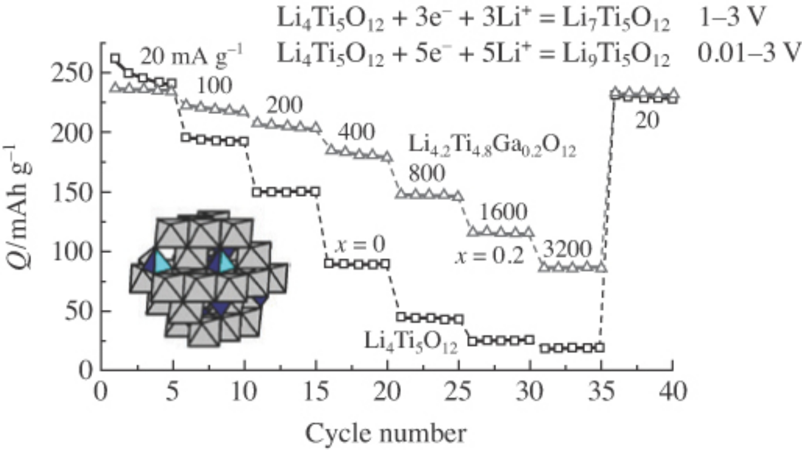 New anode materials based on gallium-doped lithium titanate were obtained. Doping leads to an increase in the capacity of lithium titanate and its cycling stability in an extended potential range from 0.01 to 3V.
