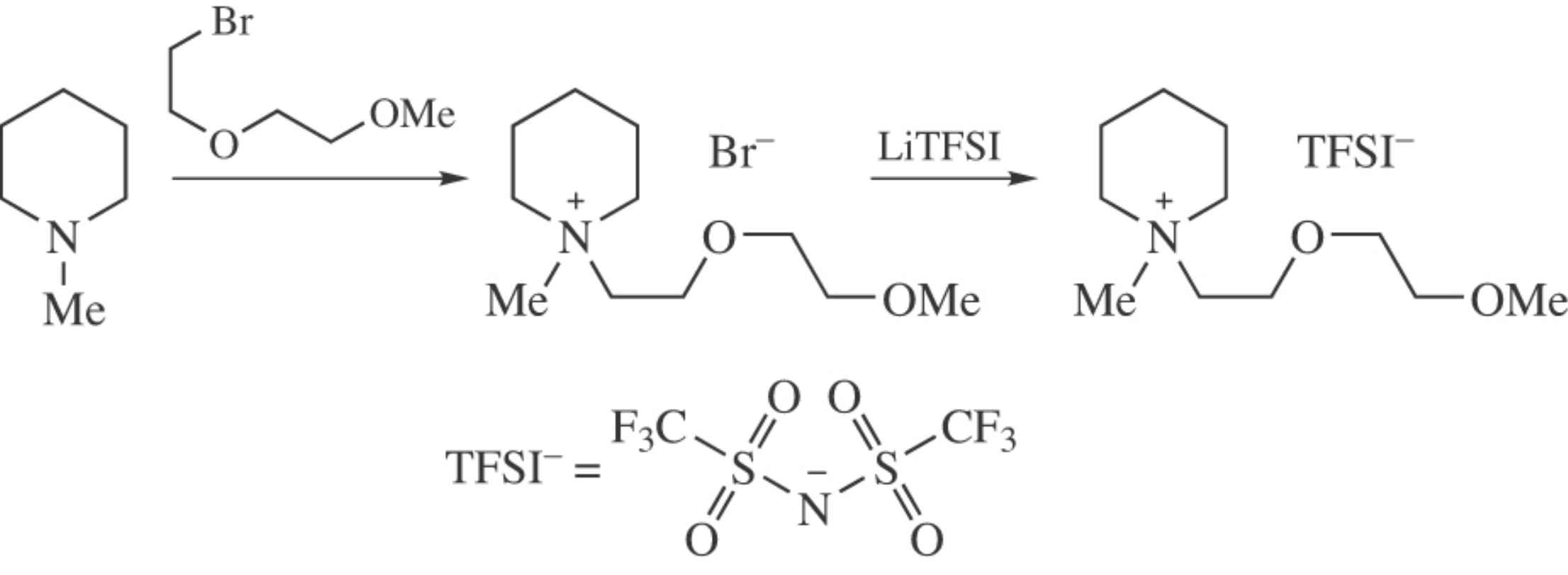The novel ionic liquid N-methyl-N-[2-(2-methoxyethoxy)-ethyl]piperidinium bis(trifluoromethylsulfonyl)imide was synthesized from N-methylpiperidine by a sequence of nucleophilic substitution and anion exchange reactions and characterized by physico-chemical and electrochemical methods.