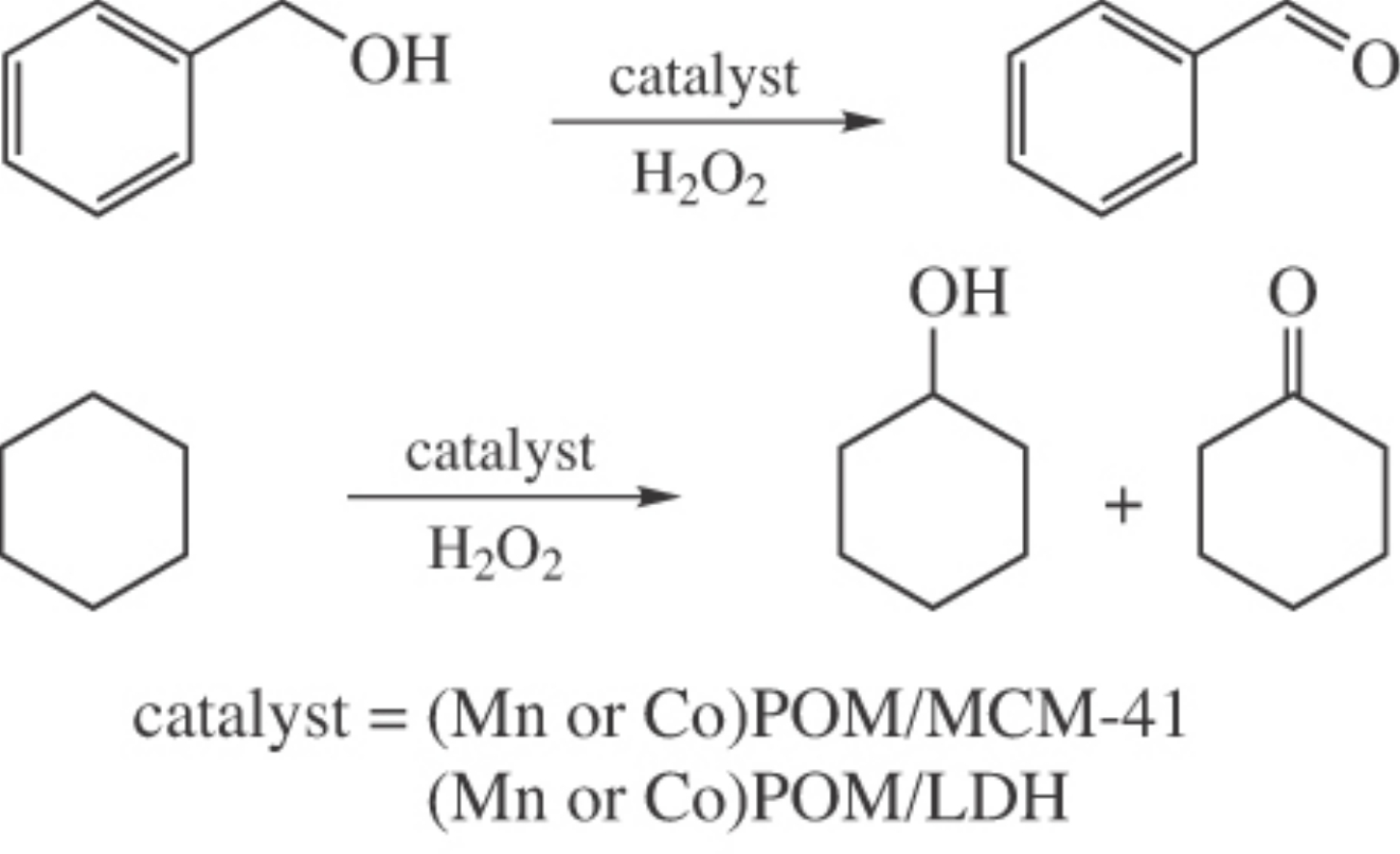 The Mn- and Co-substituted polyoxotungstates [MPW11O39]5– (M = Mn or Co) supported on MCM-41 or into interlayer of Mg3Al-layered double hydroxide show catalytic activity for the solvent-free oxidation of benzyl alcohol and cyclohexane with H2O2.