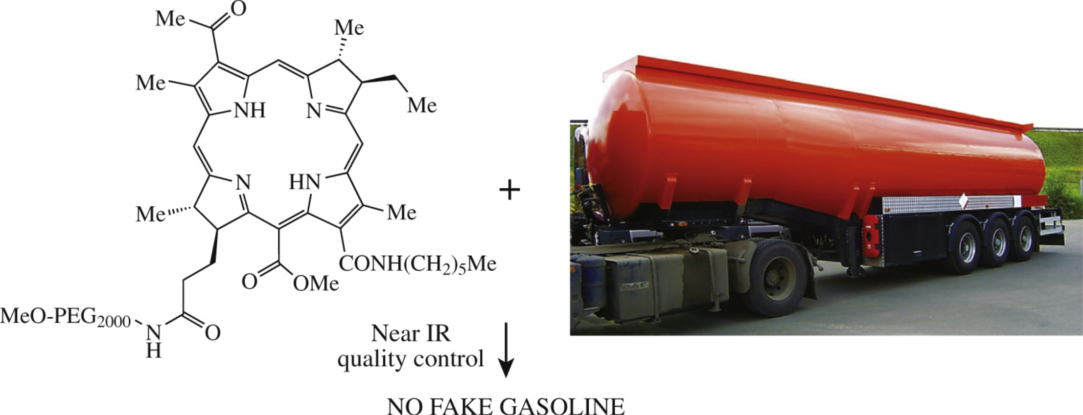 The measurement of the near IR spectra of strongly diluted and concentrated solutions of bacteriochlorin derivative in liquid products (hydrocarbons, industrial alcohols) indicated the absence of aggregation to show the prospects of its use under the inconstant optical path conditions through containers as an efficient method for checking the authenticity or degree of dilution with enhanced possibilities for simultaneous analyses of traditional quality parameters.