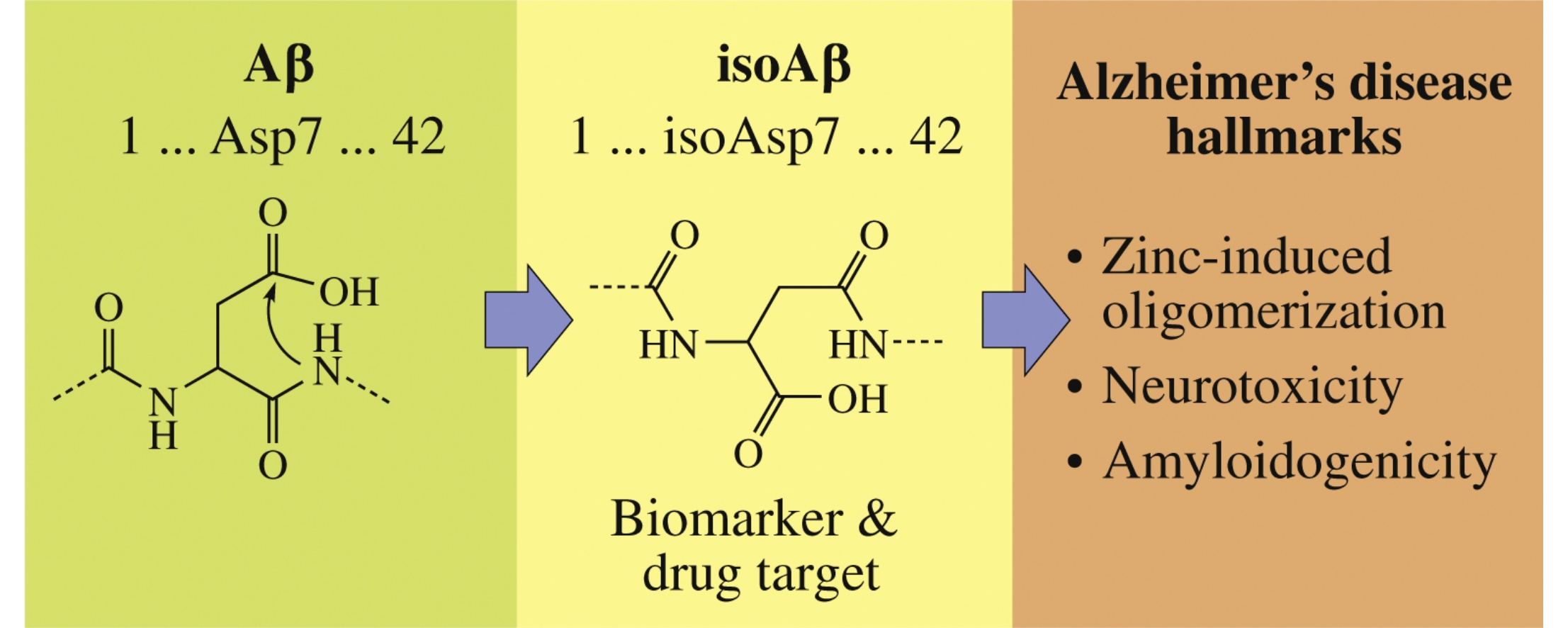 Recent data about structure, interaction with biometals, aggregation state, proteolysis by angiotensin converting enzyme, neurotoxicity and amyloidogenicity of amyloid-β containing isoaspartate 7 (isoAsp7-Aβ) in comparison with intact amyloid-β are summarized. Possible role of isoAsp7-Aβ as a prospective biomarker for molecular diagnostics and drug target in anti-amyloid therapy of Alzheimer's disease is discussed.