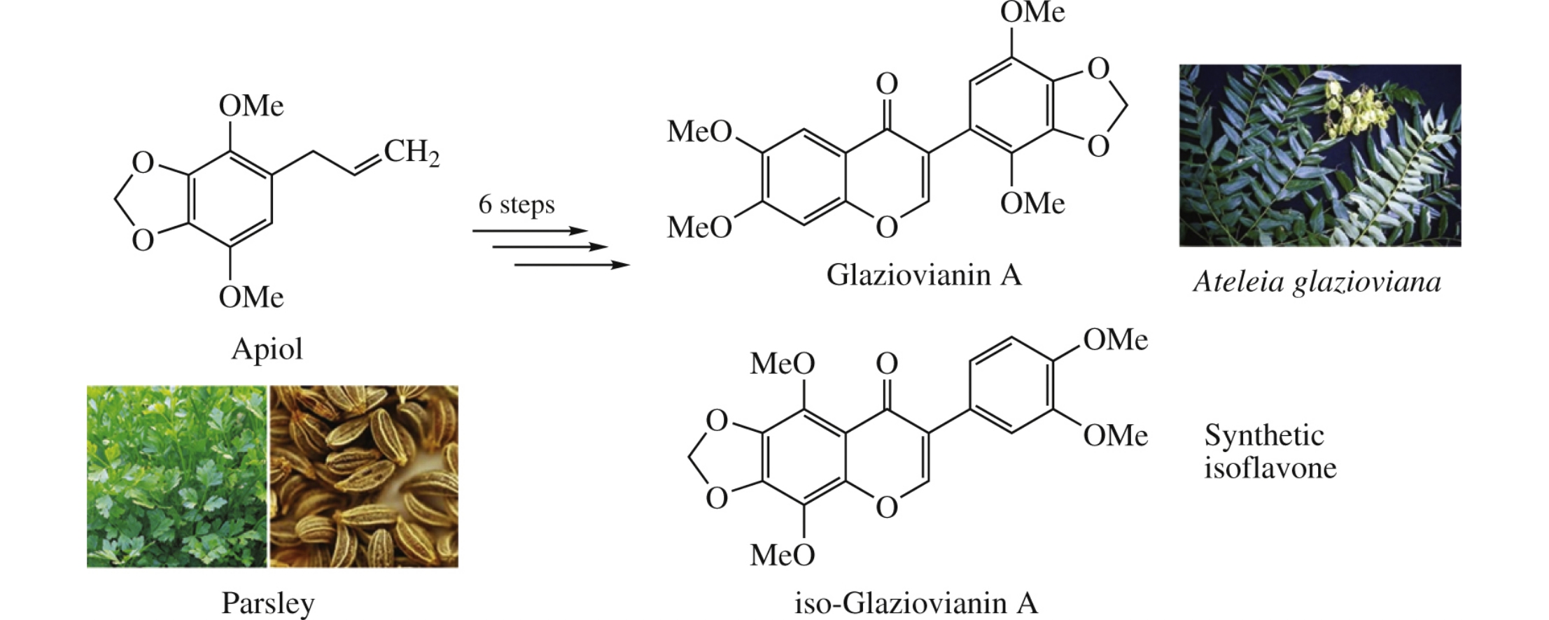 Glaziovianin A and its analogues were synthesized in six steps starting from allylpolyalkoxybenzenes separated from essential oils of dill (Anetum graviolens) and parsley (Petro-selinum sativum) seeds.