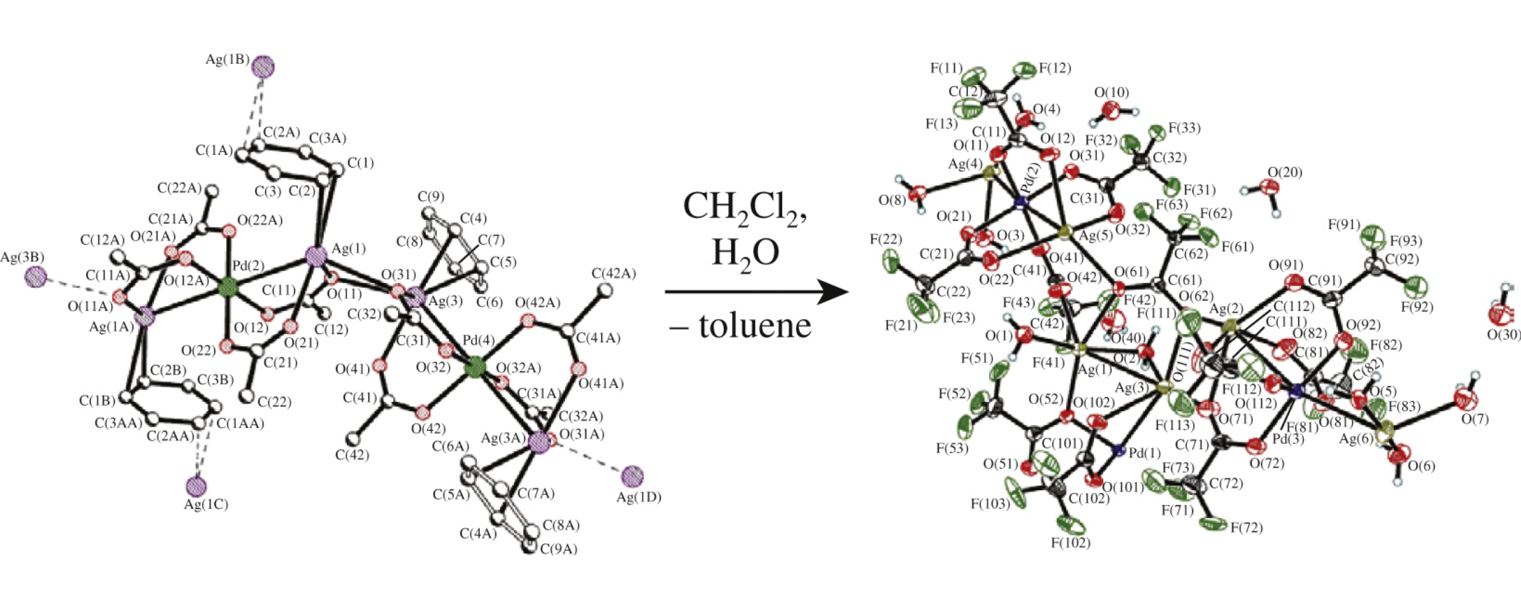 The first polynuclear heterodimetallic Pdii–Agi trifluoroacetate π-complex with Agi η2- and η4-coordinated molecules of toluene, namely, PdAg2(μ-TFA)4(η2-Tol)2(μ-η4-Tol)]n and [Pd2Ag4(μ-TFA)8(η2-Tol)2(μ-η4-Tol)]n (TFA = OCOCF3, Tol=toluene) as well as the unique seventeen nuclear Pdii–Agi trifluoroacetate complex Pd5Ag12(H2O)16(μ-TFA)8·7H2O have been synthesized. Their solid-state structure was determined by X-ray method.