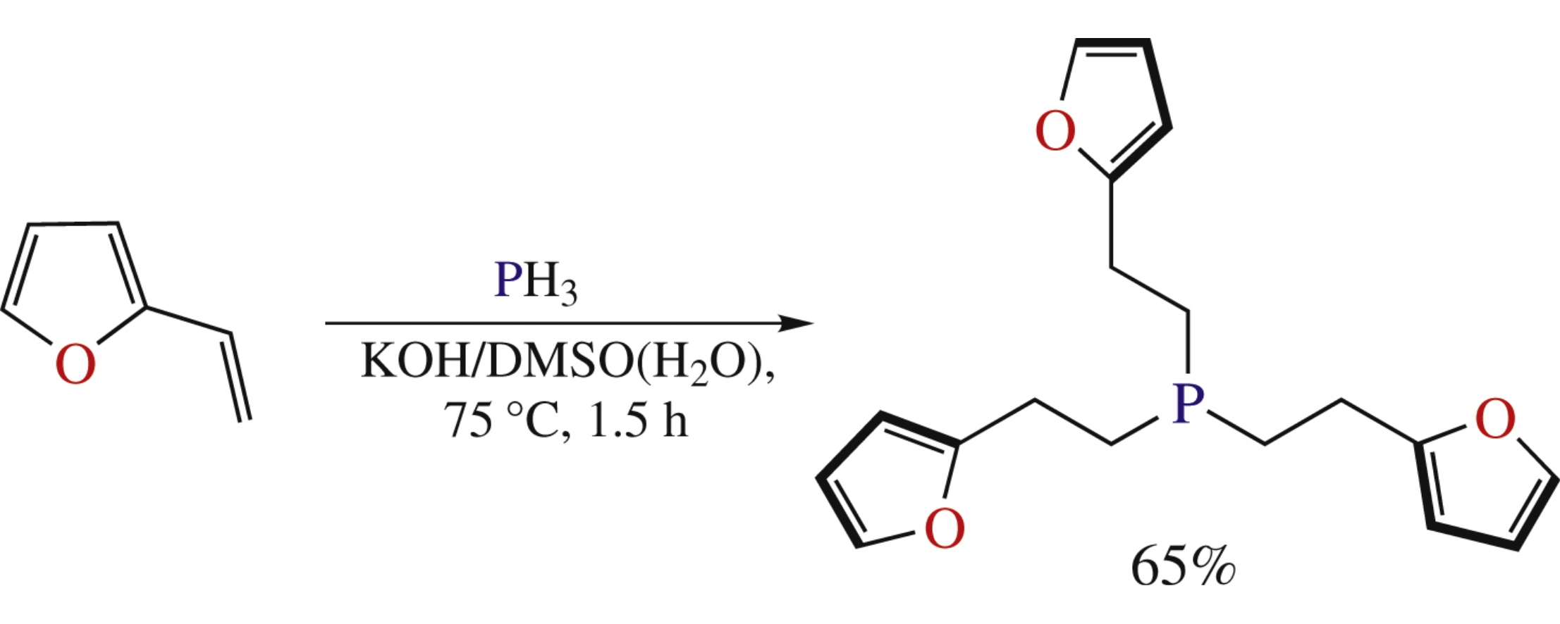 Nucleophilic addition of PH3 to 2-vinylfuran in the KOH/DMSO(H2O) suspension affords 65% of tris[2-(2-furyl)ethyl]-phosphine, whose treatment with H2O2, Se or PdCl gives the corresponding phosphine oxide, selenide and complex of trans-[Pd(L)2Cl2] type in good to excellent yields.
