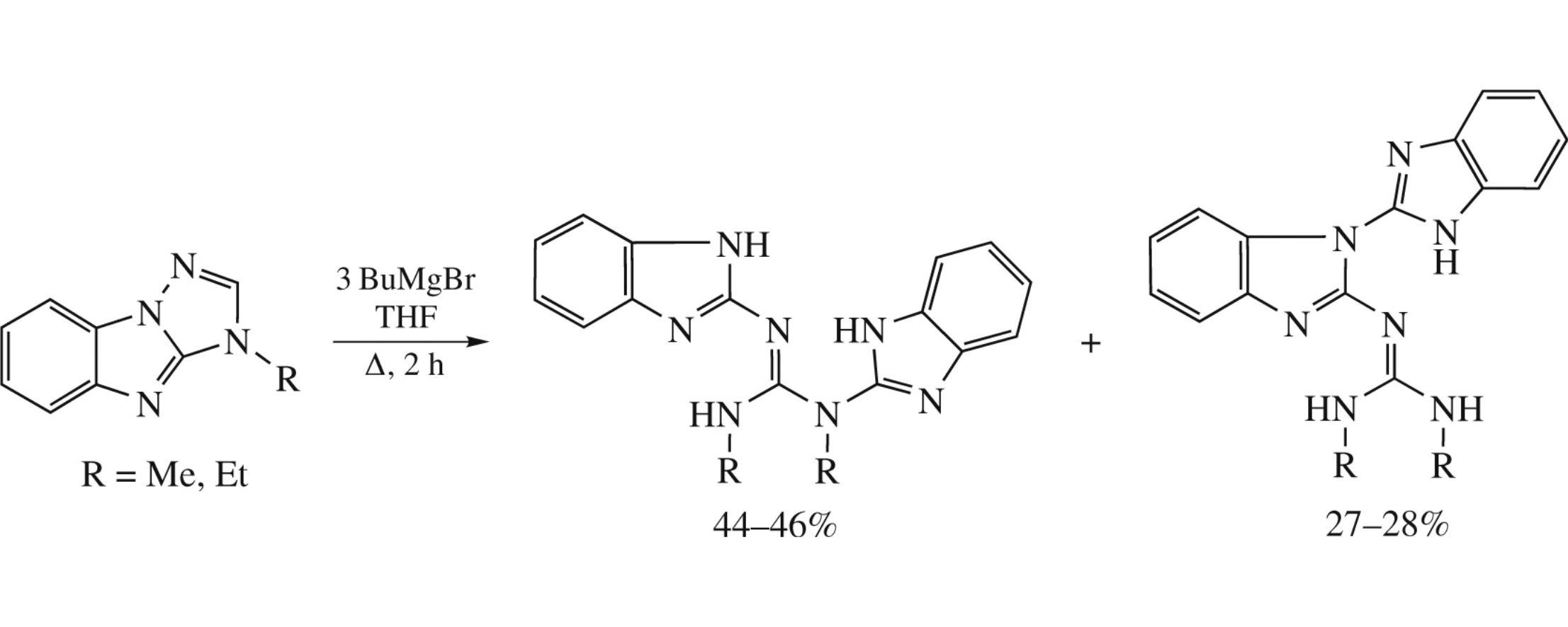 Reaction of 3-alkyl-1,2,4-triazolo[1,5-a]benzimidazoles with butylmagnesium bromide follows two hetarylotropic rearrangements to afford 1,2-bis(1H-benzimidazol-2-yl)-1,3-dialkylguanidines and 2-(1’H-1,2’-dibenzimidazol-2-yl)-1,3-dialkylguanidines.