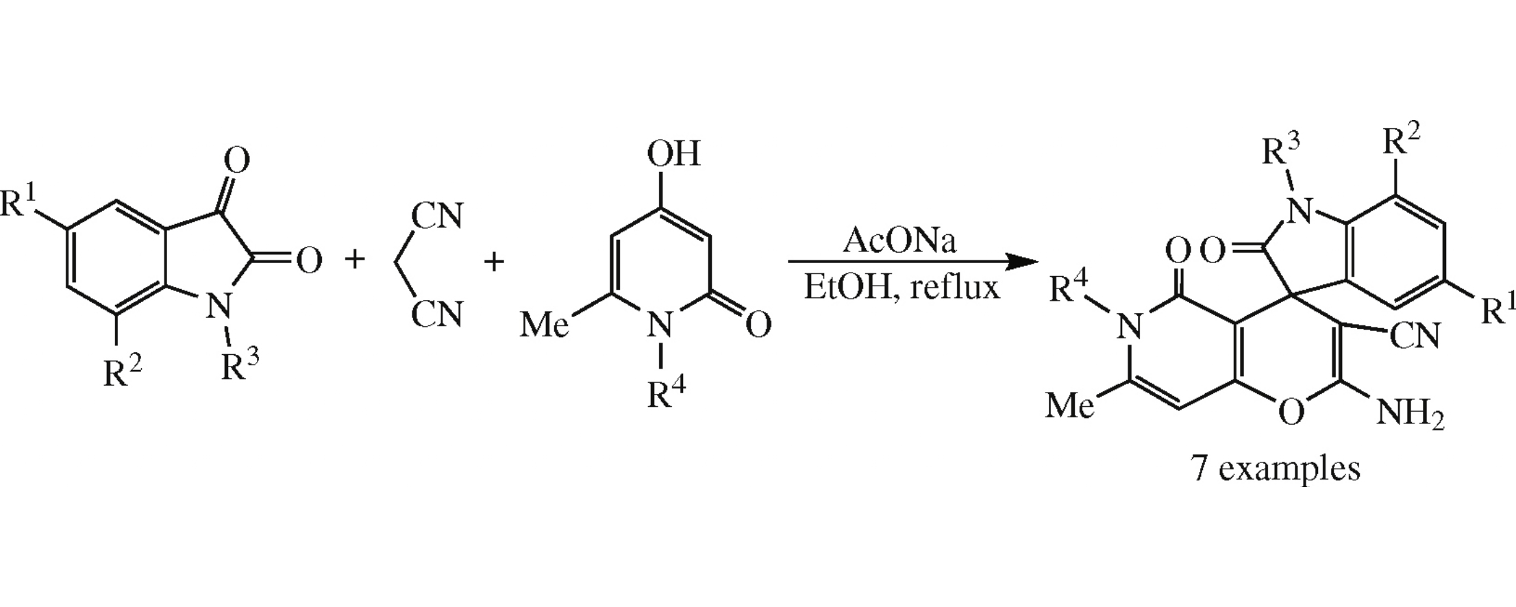 The new one-pot multicomponent assembling of isatins, malononitrile and 4 hydroxy-6-methylpyridin-2(1H)-ones into previously unknown 2’-amino-7’-methyl-2,5’-dioxo-5’,6’-dihydrospiro[indoline-3,4’-pyrano[3,2-c]pyridine]-3’-carbonitriles in 80–98% yields has been accomplished by their reflux in ethanol in the presence of sodium acetate.