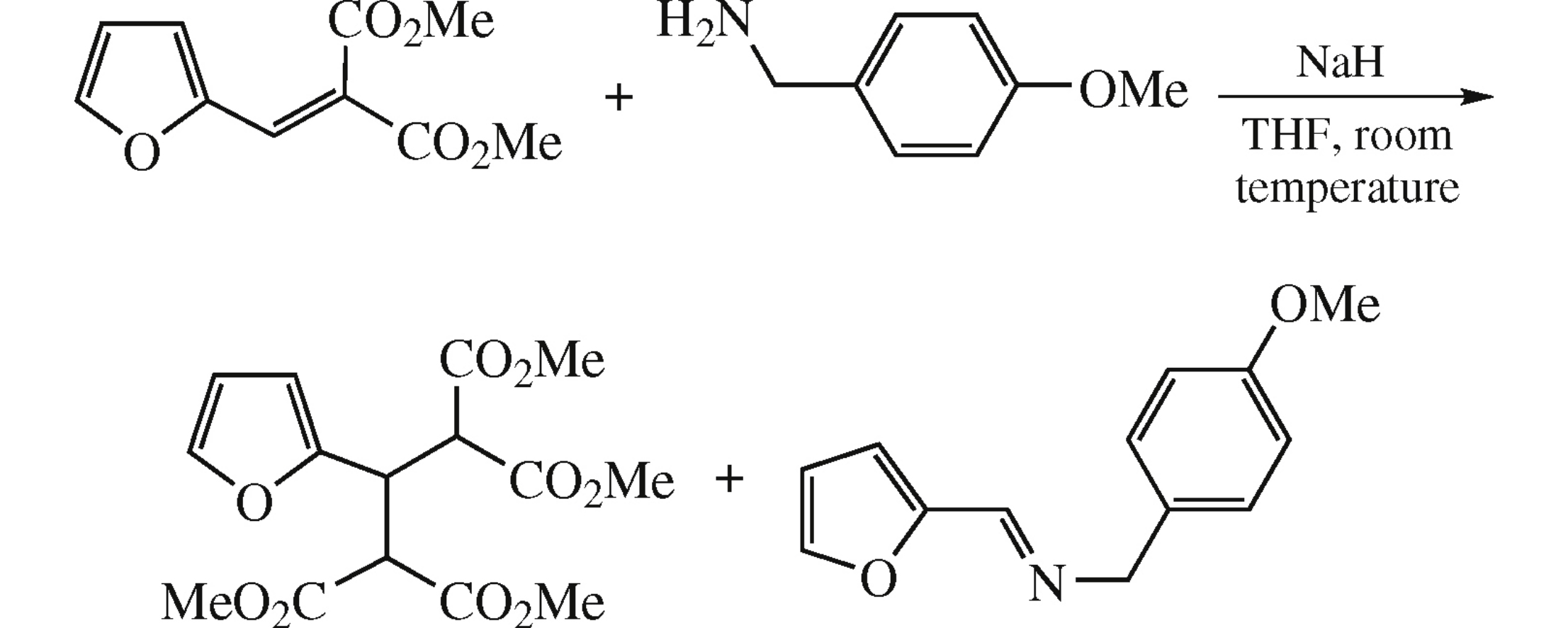 Sodium hydride-promoted disproportionation of the title compounds affords tetramethyl 2-(2-furyl)propane-1,1,3,3-tetracarboxylate and furfural N-(4-methoxybenzyl)imine.