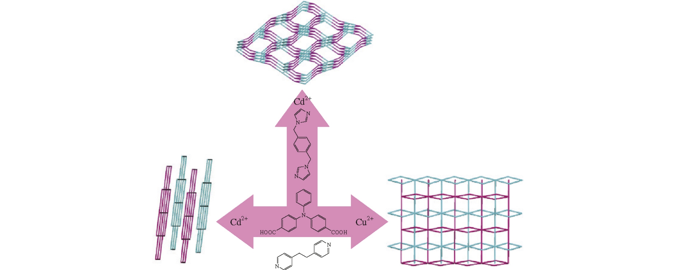Three novel metal-organic frameworks based on an N-centered ligand H2L [4,4’-(phenylazanediyl)dibenzoic acid], namely, [Cd(L)(bimx)1/2], [Cd(L)(dpe)]·H2O, [Cu(L)(dpe)1/2]·H2O, [bimx = 1,4-bis(imidazol-1-ylmethyl)benzene, dpe = 1,2-di-(pyridin-4-yl)ethane], have been obtained and characterized by elemental analysis and X-ray single-crystal diffraction. Their thermal stability properties are also discussed in detail.